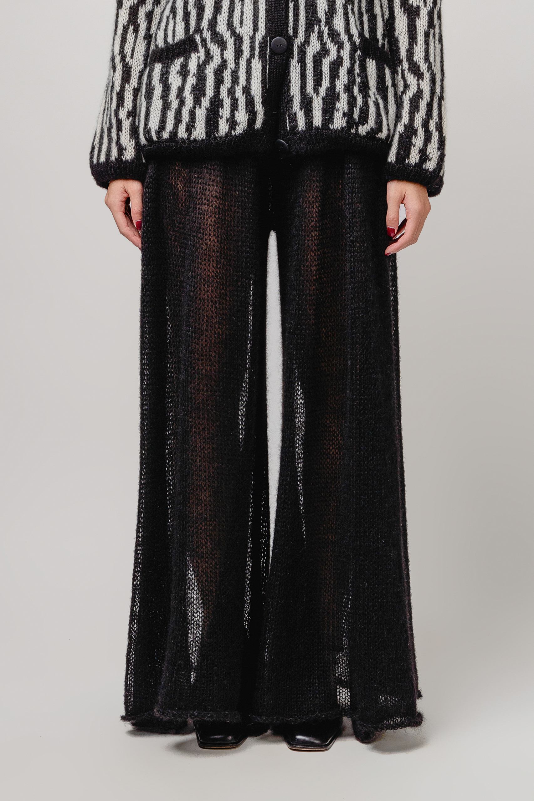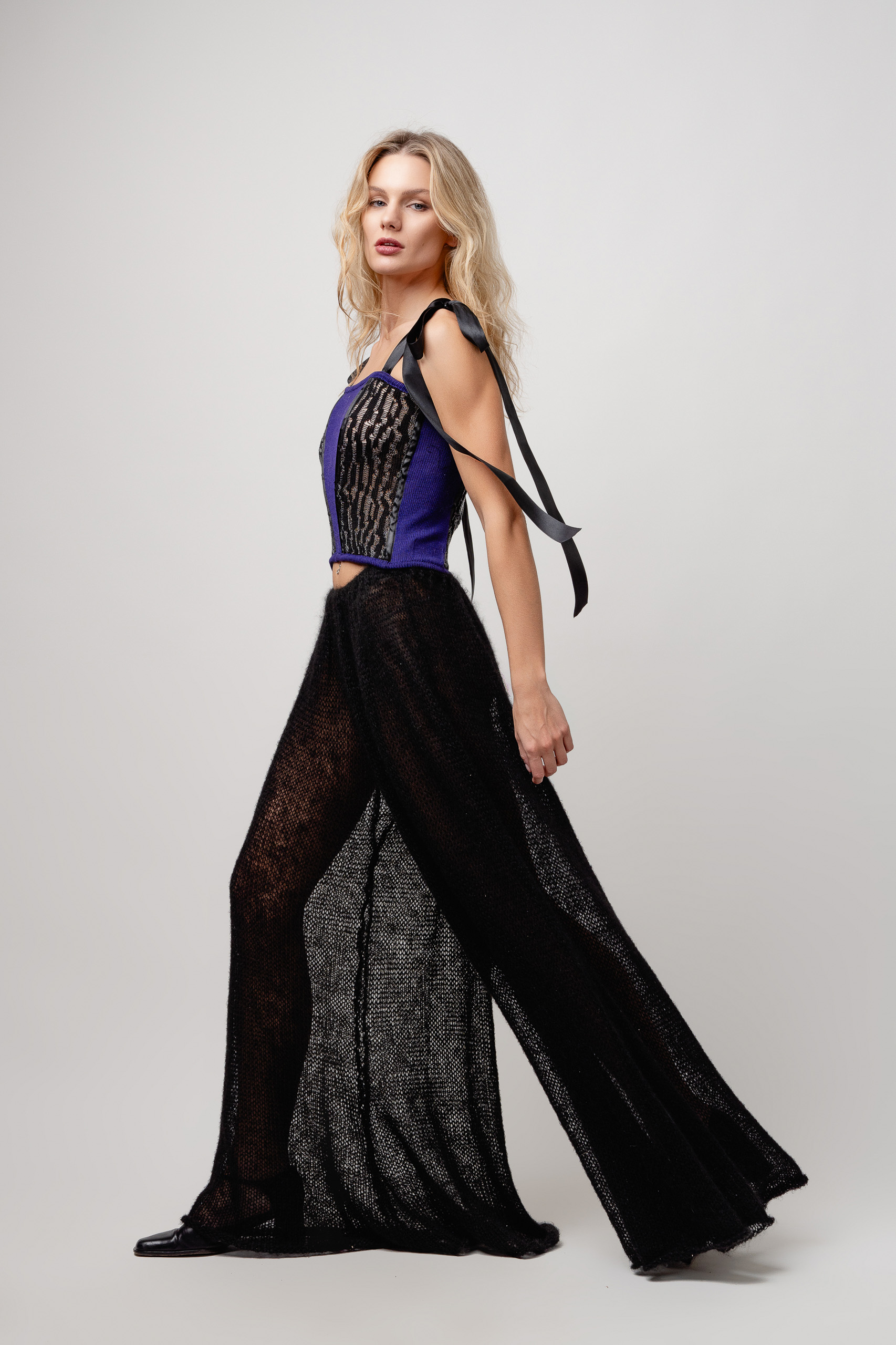 Jaapani siidimohäärilõngast käsitsi valmistatud. Pehme, läbi paistev kiht, mis liigub vabalt kehaga kaasa. Eriti avar siluett reguleeritava paelaga vöökohaga.