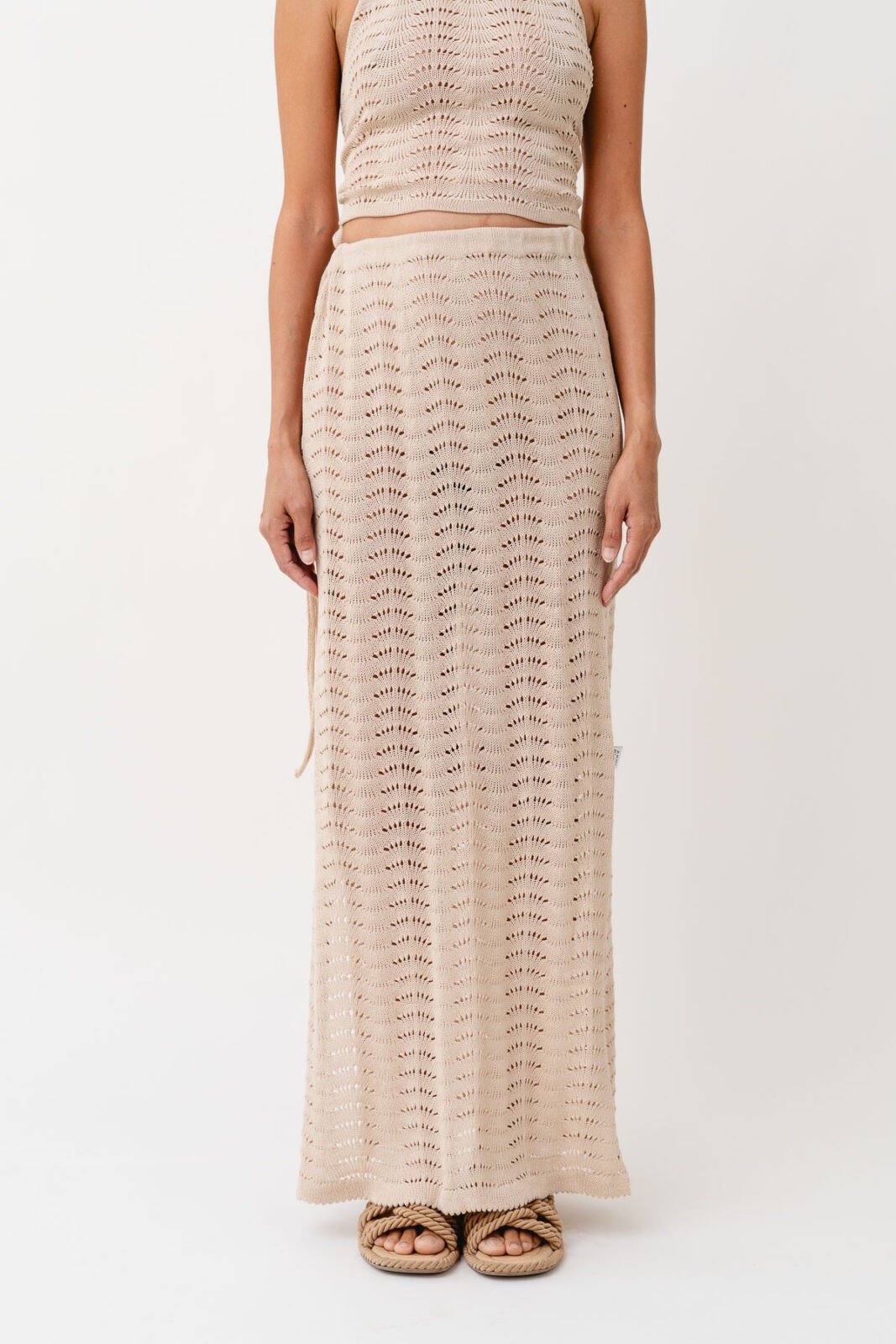 Hand made from cotton lace. A breathable layer, that is slightly seethrough. Full length with a side slit hem, and adjustable drawstring waist.