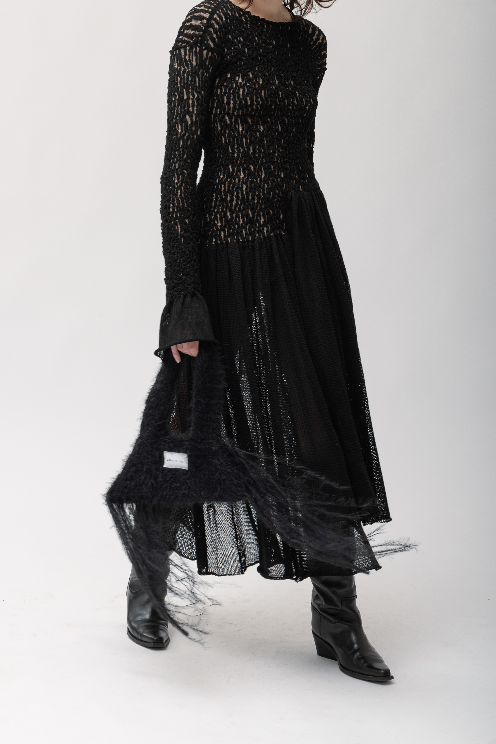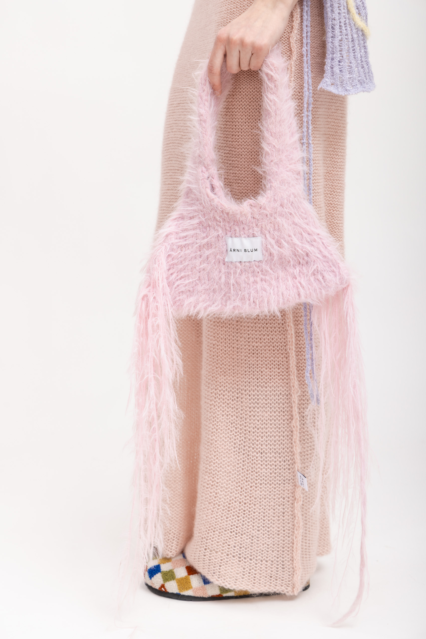 Hand made from fuzzy wool blend yarn. Finished with long fringe details.