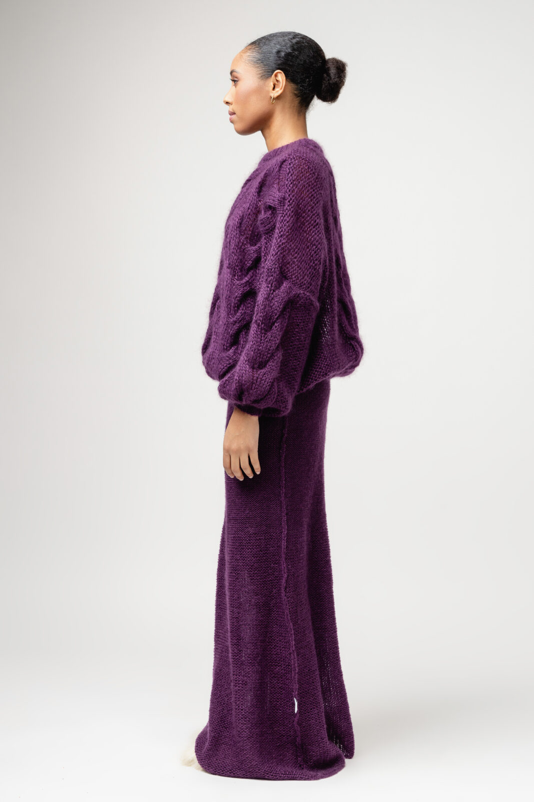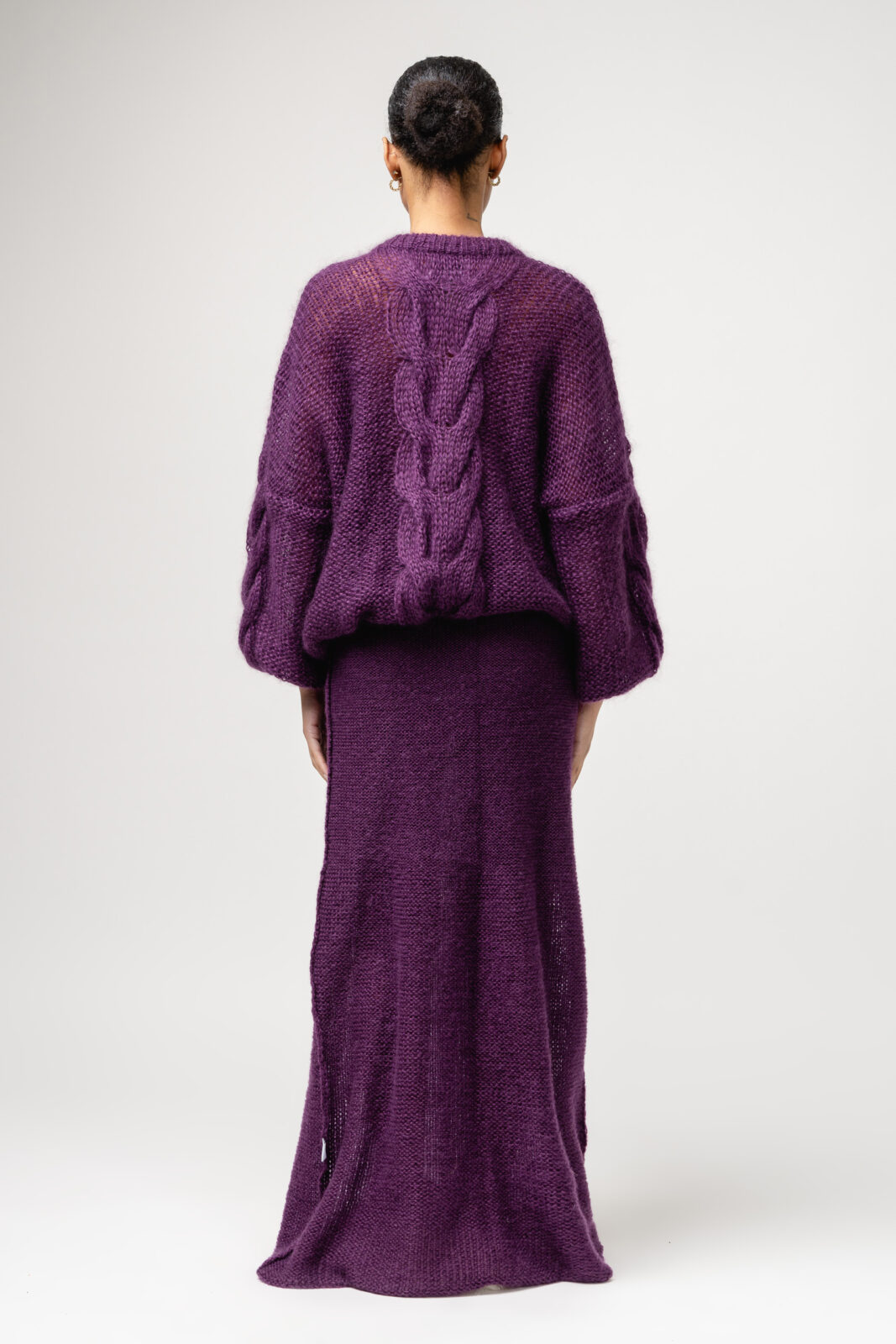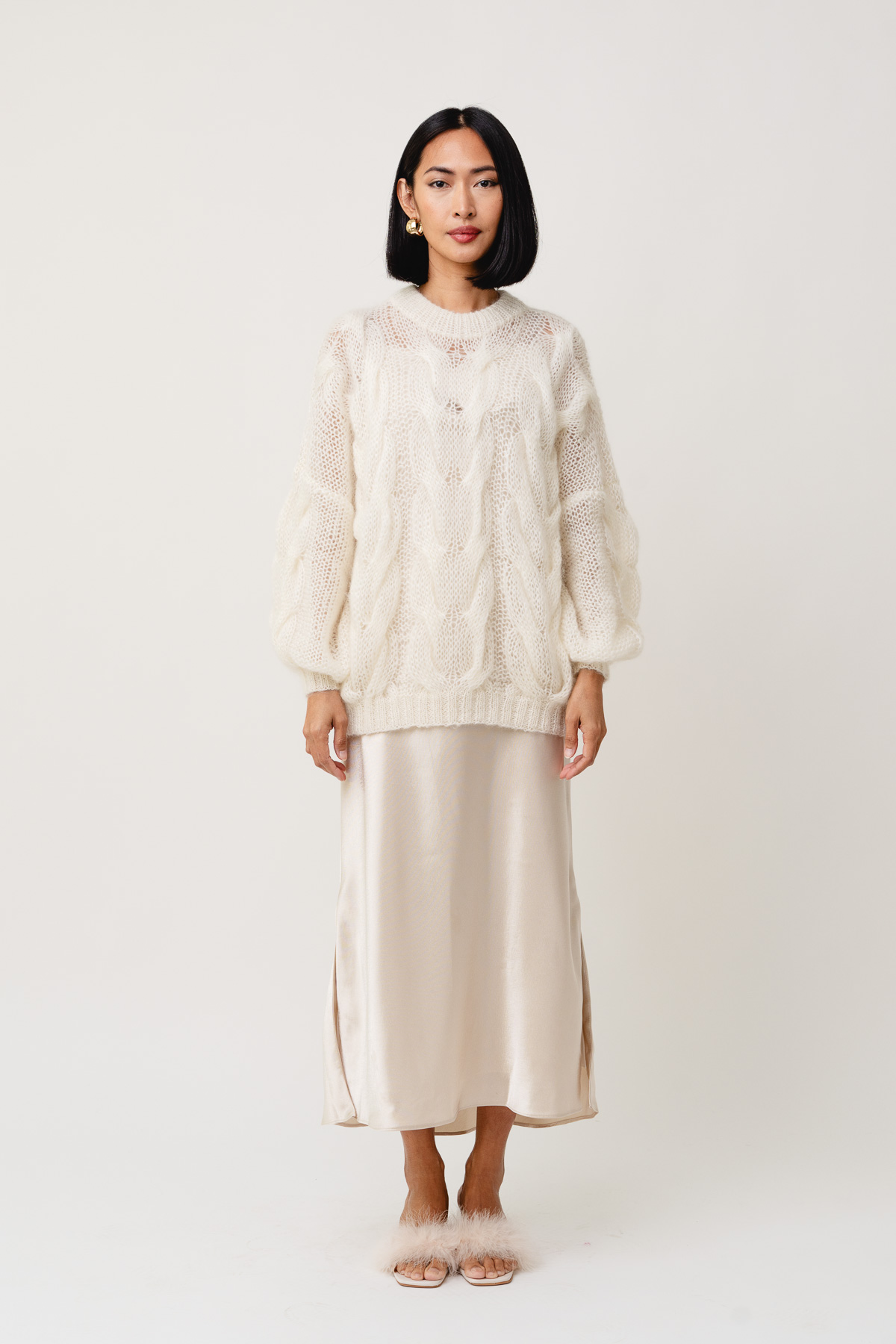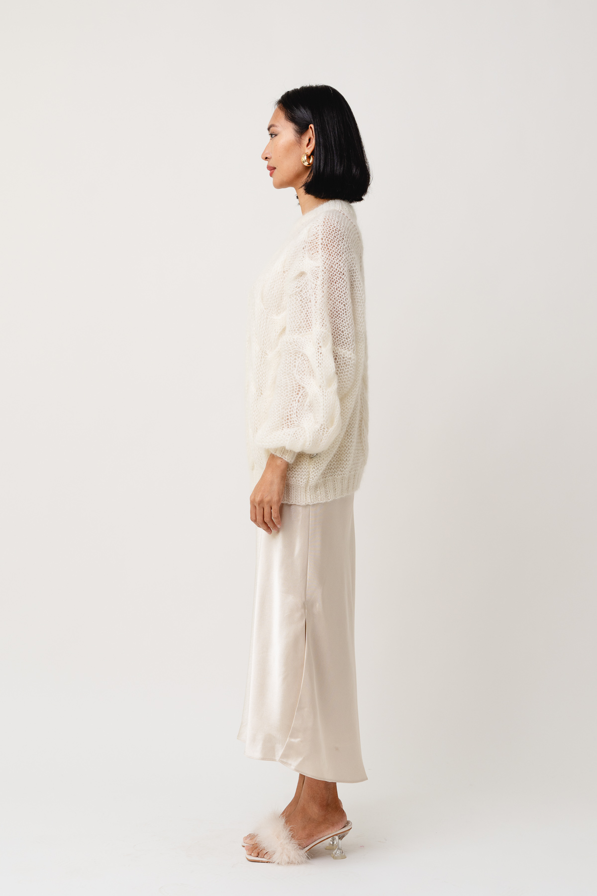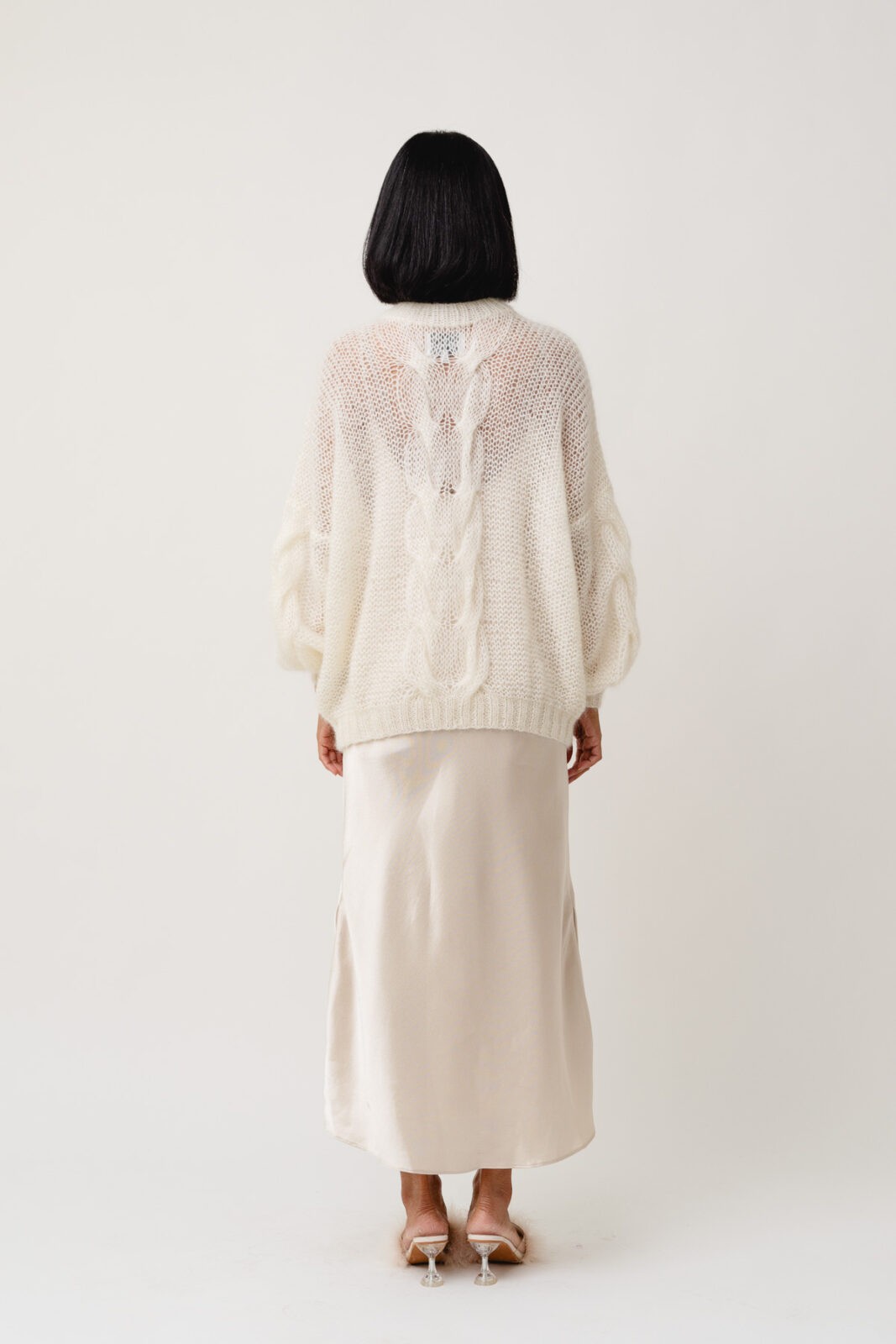 Hand knitted from Japanese silk mohair yarn, creating a delicate yet resilient texture. A simple, sculptural silhouette with cable knit details.