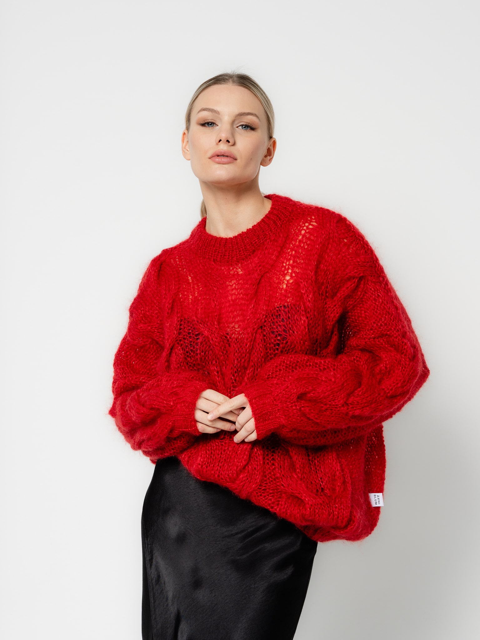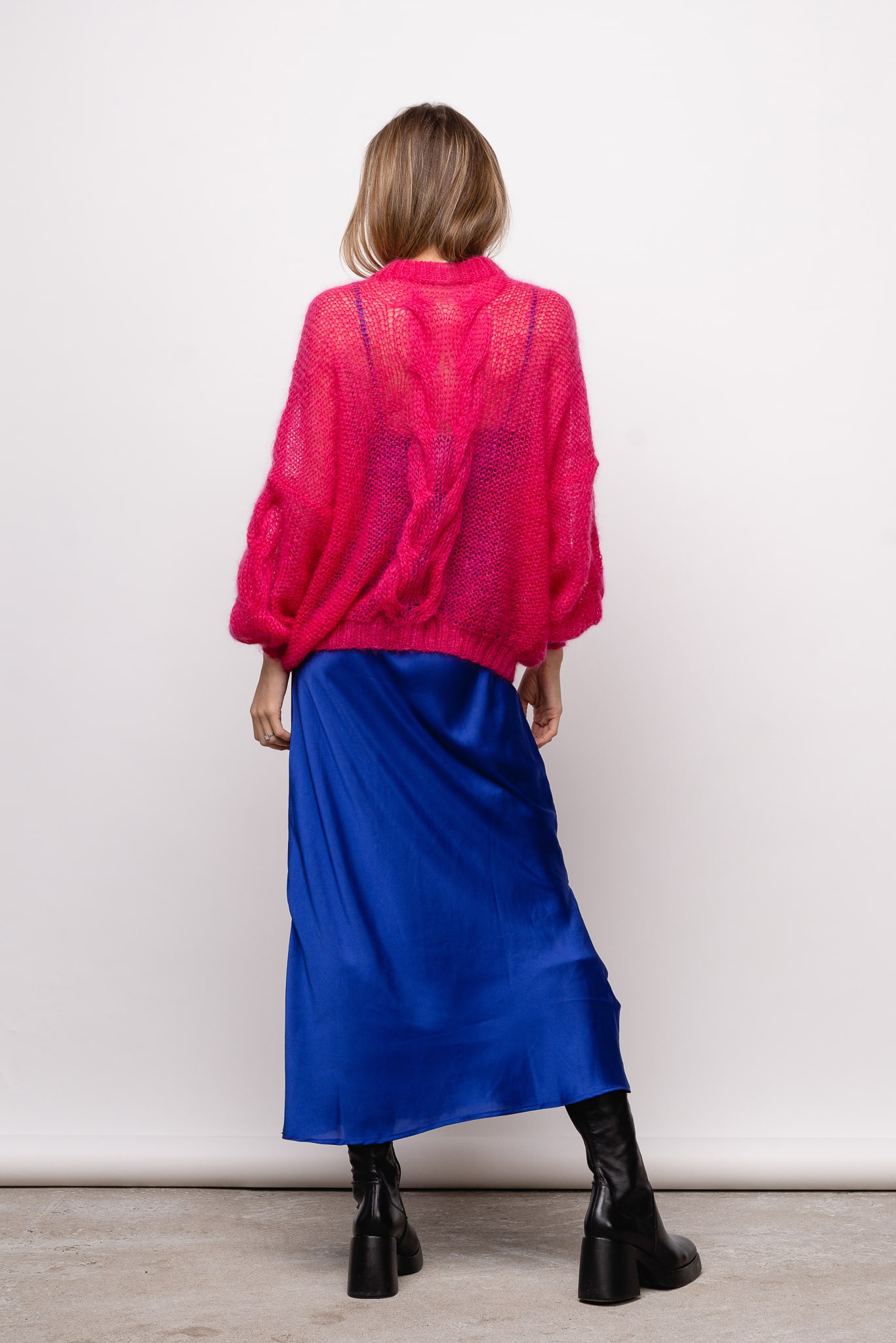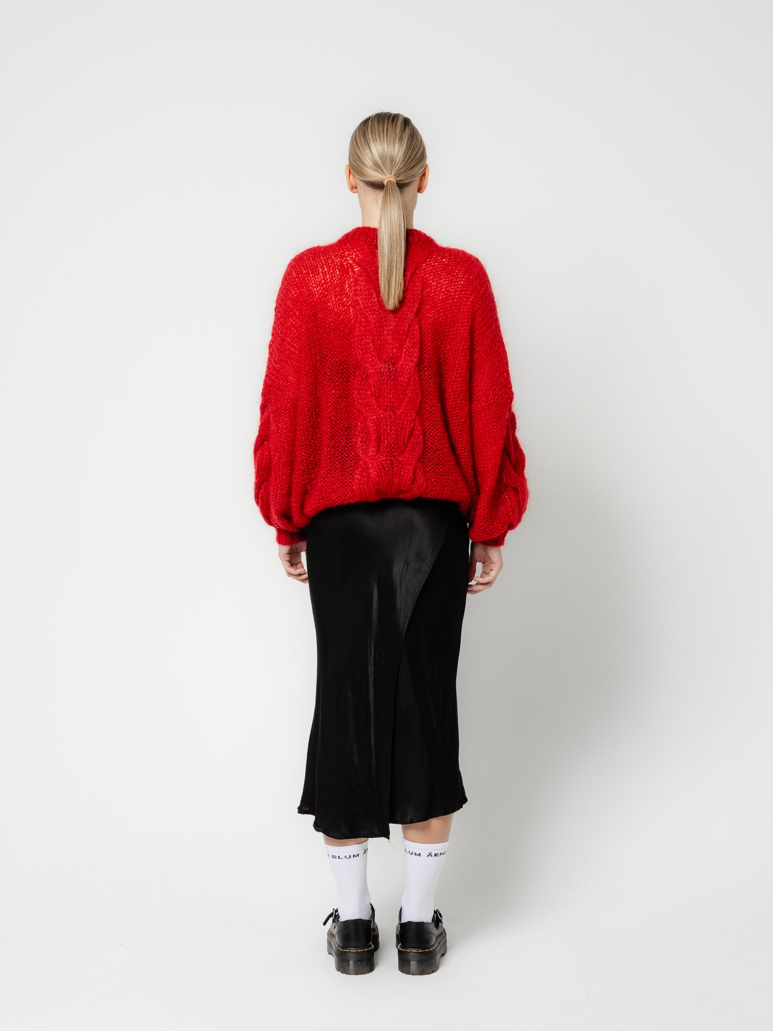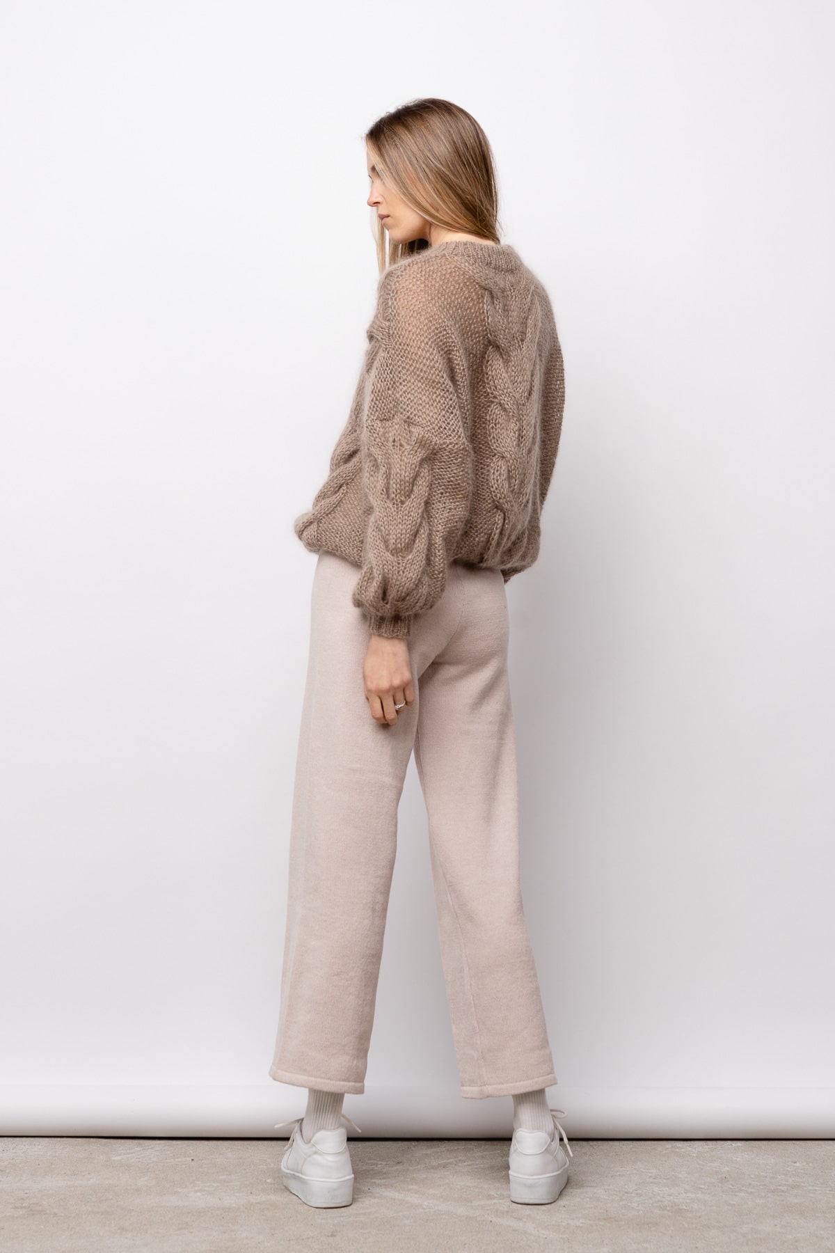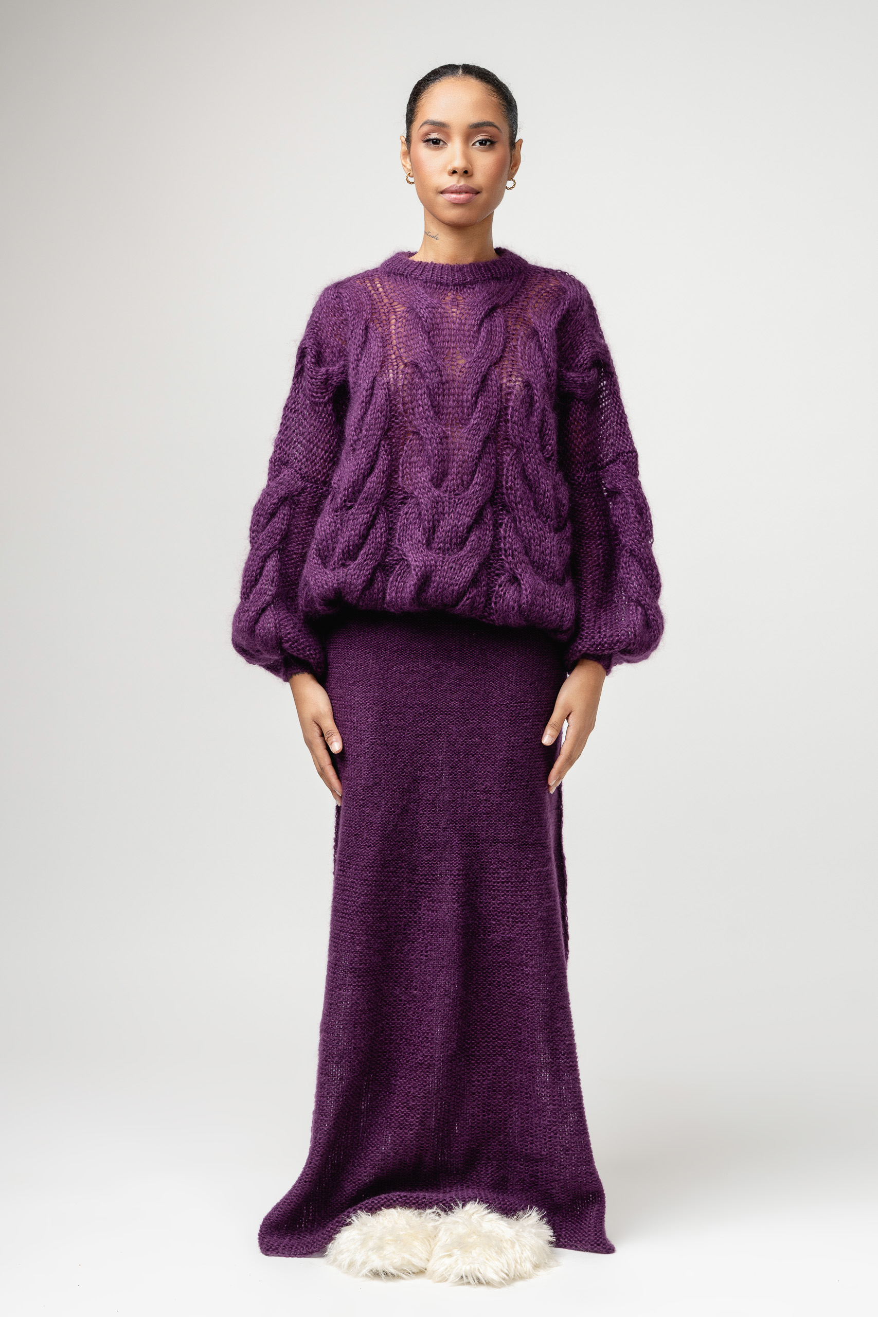 Hand knitted from Japanese silk mohair yarn, creating a delicate yet resilient texture. A simple, sculptural silhouette with cable knit details.