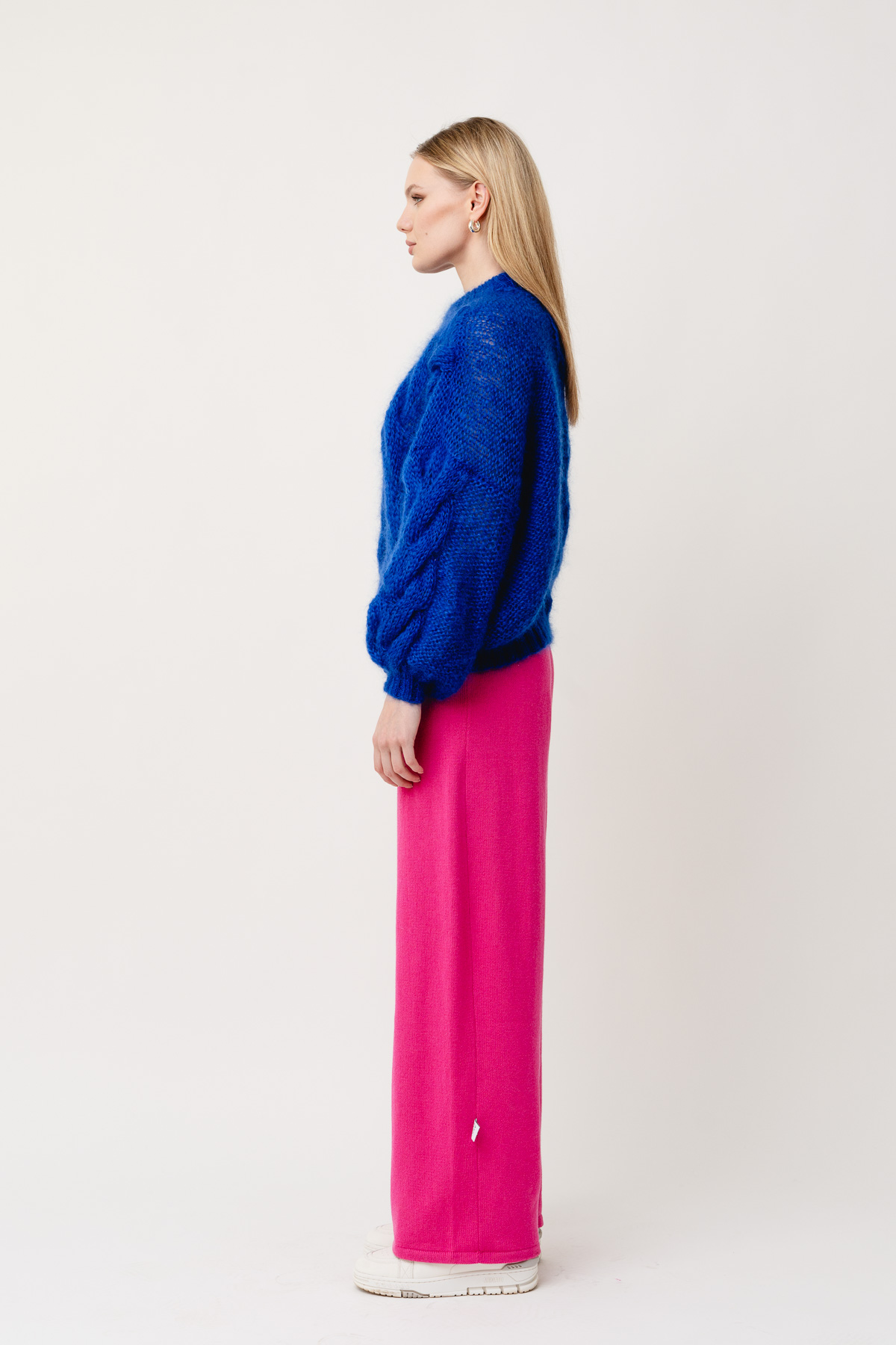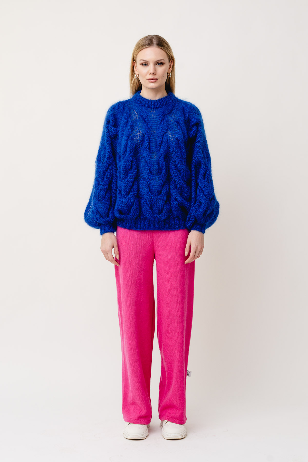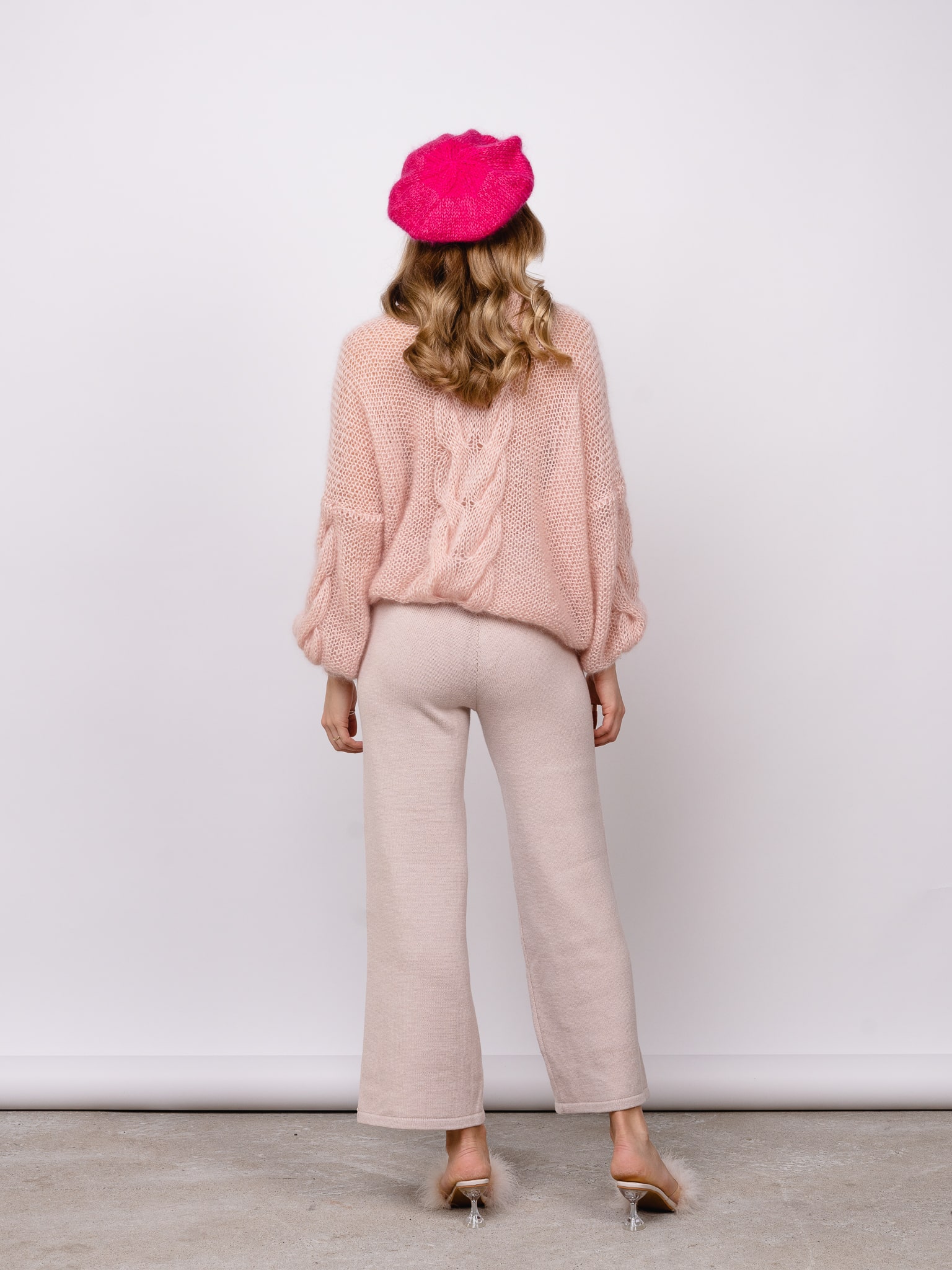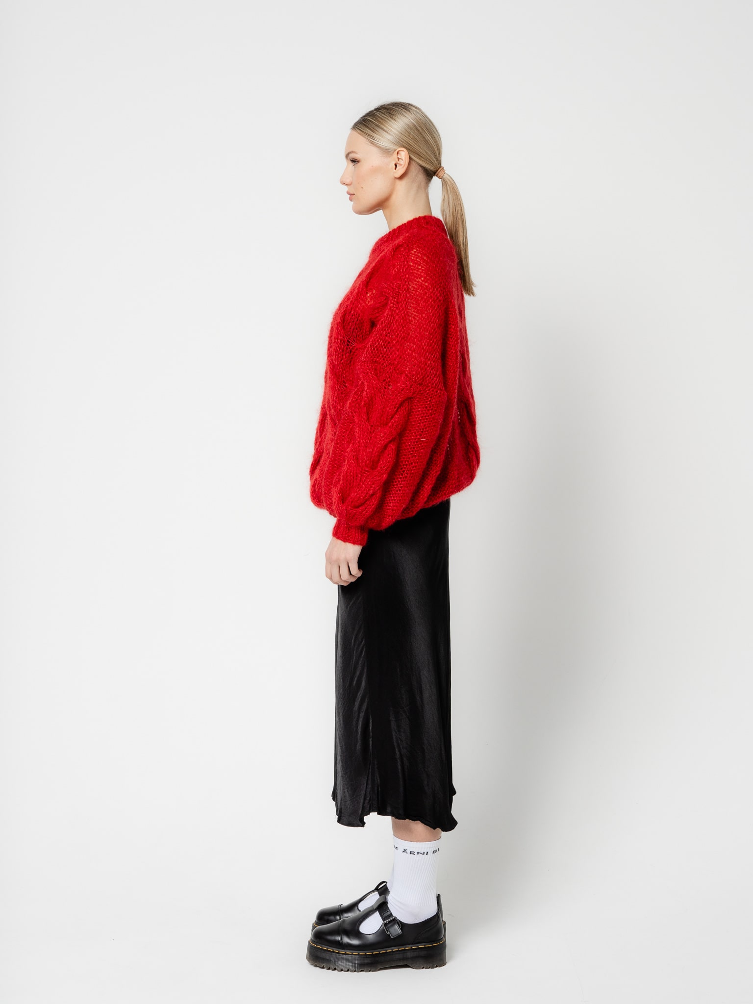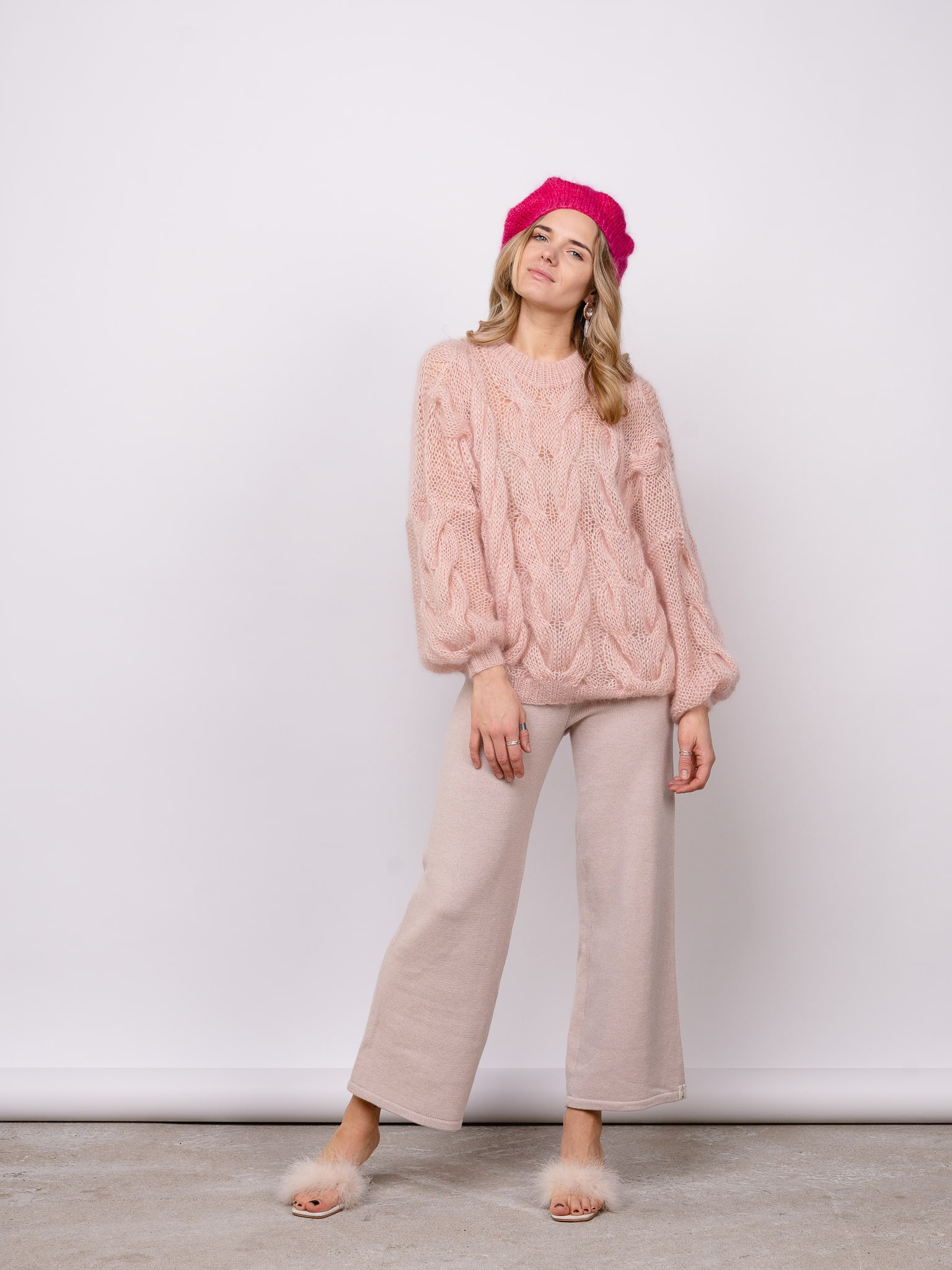 Hand knitted from Japanese silk mohair yarn, creating a delicate yet resilient texture. A simple, sculptural silhouette with cable knit details.