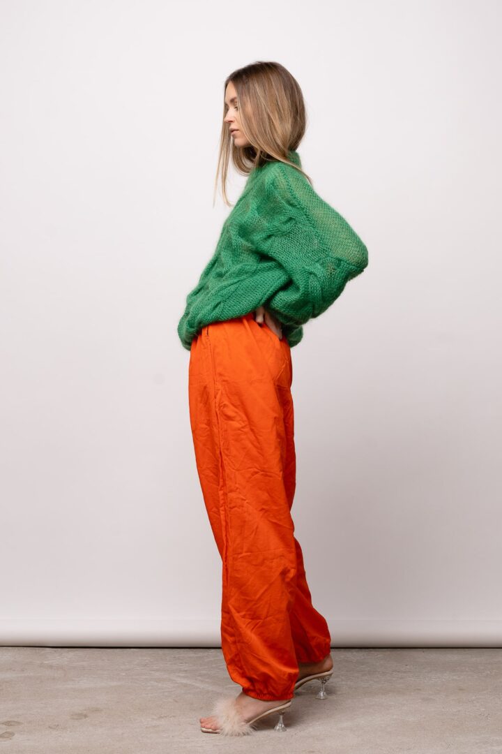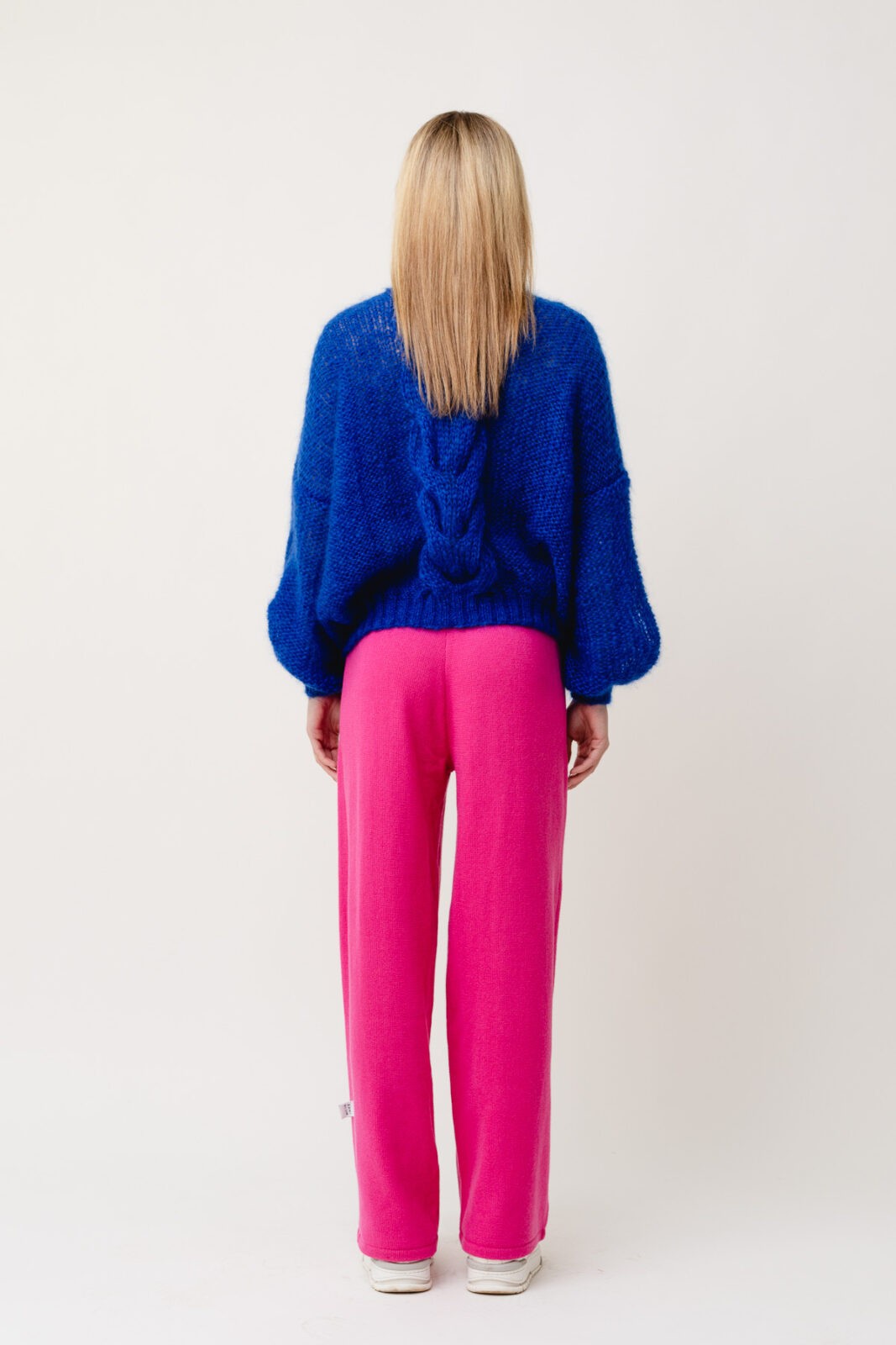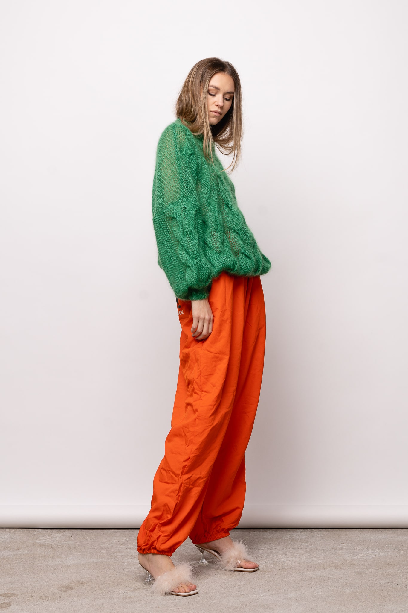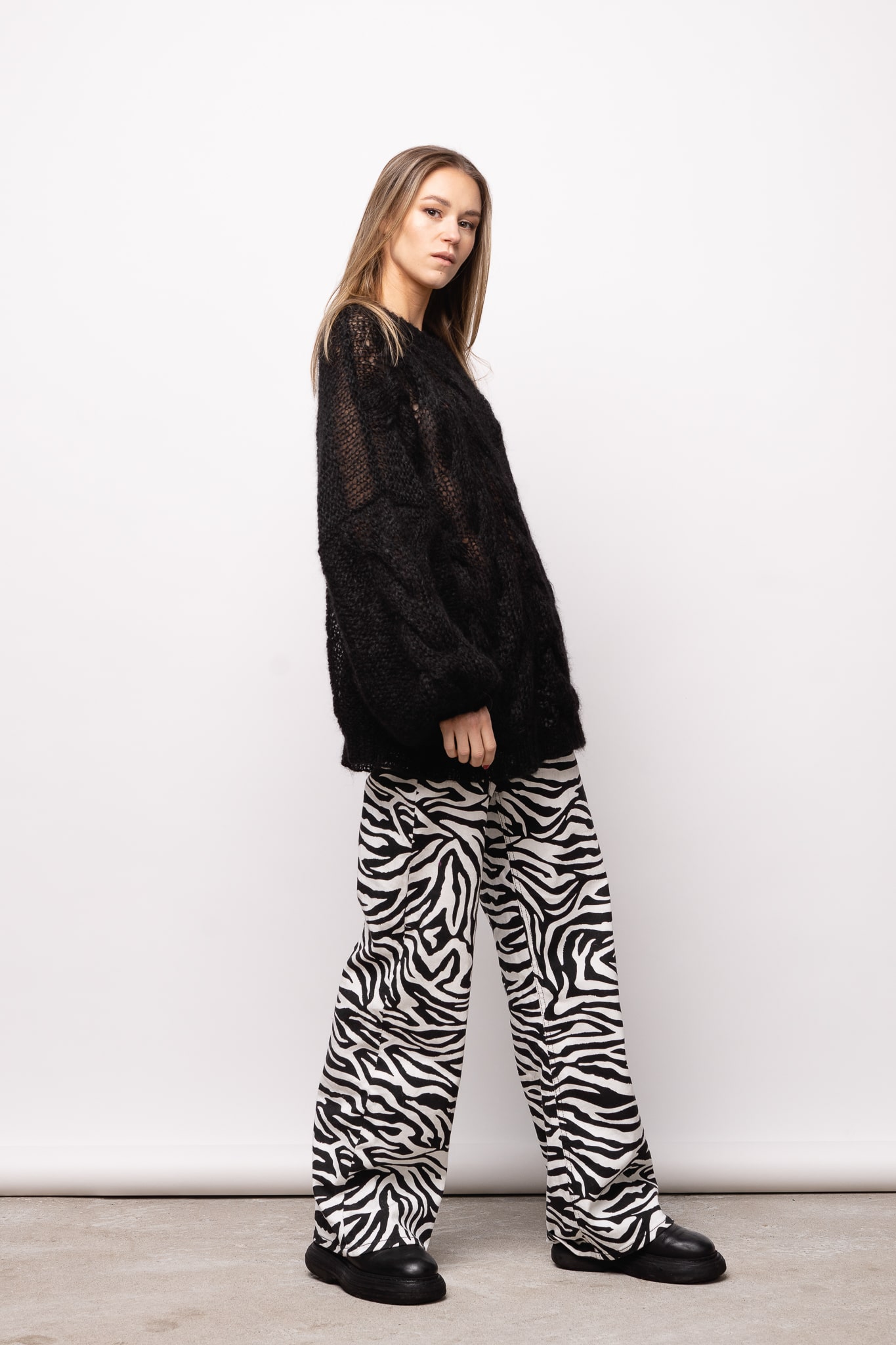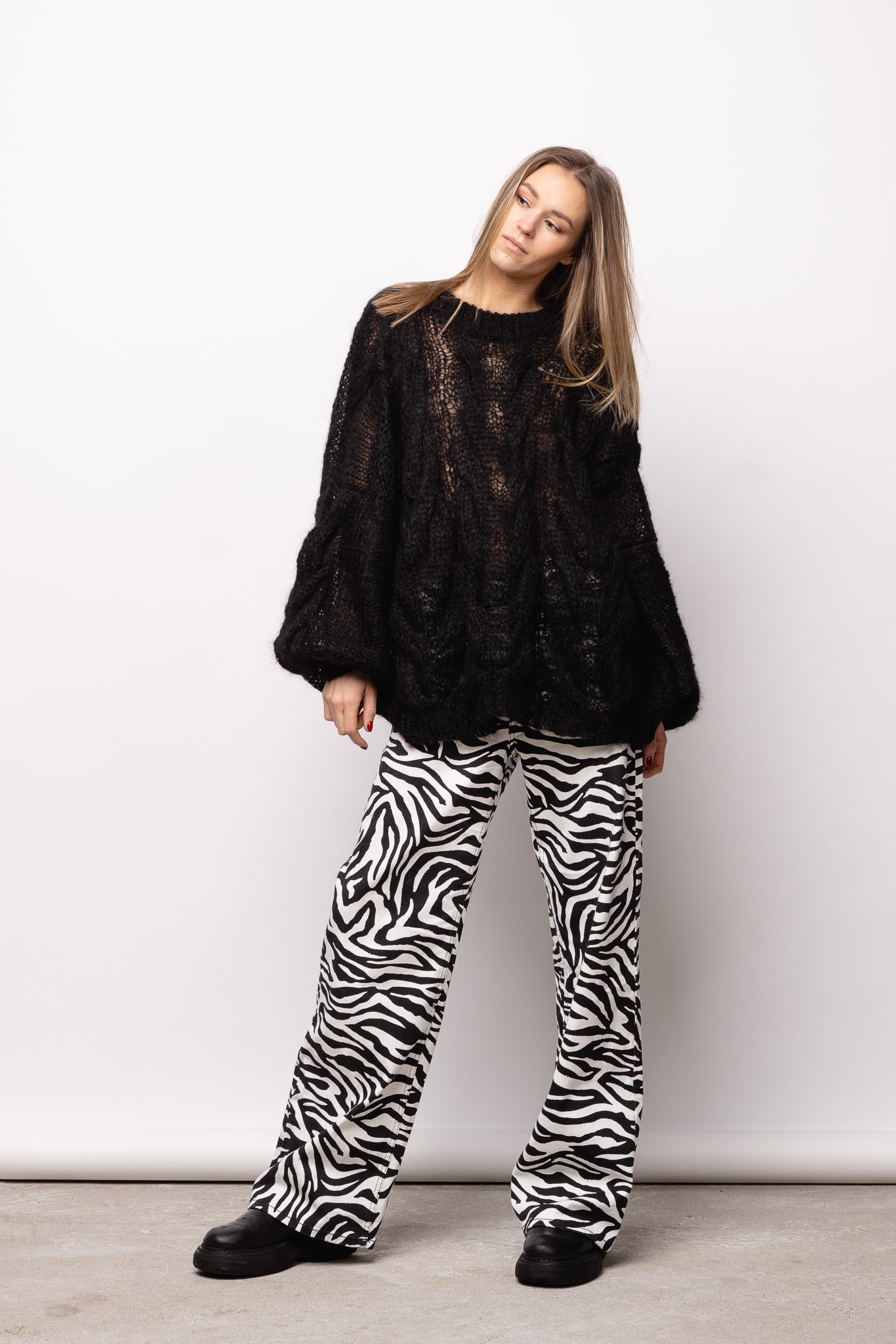 Hand knitted from Japanese silk mohair yarn, creating a delicate yet resilient texture. A simple, sculptural silhouette with cable knit details.