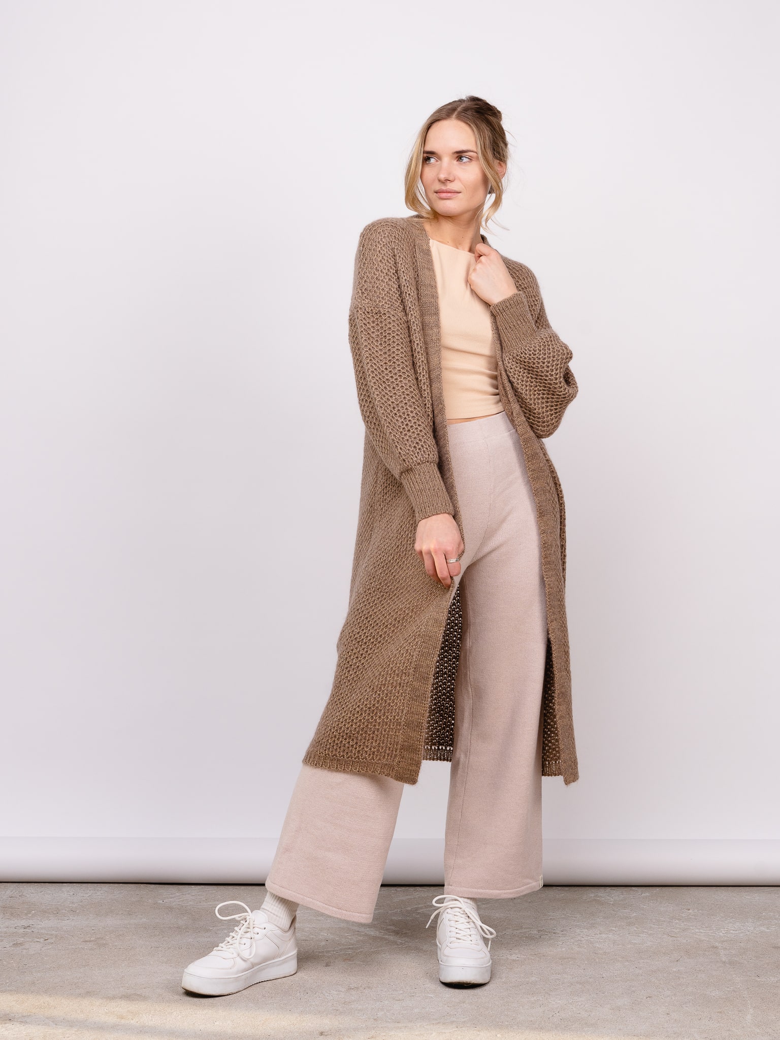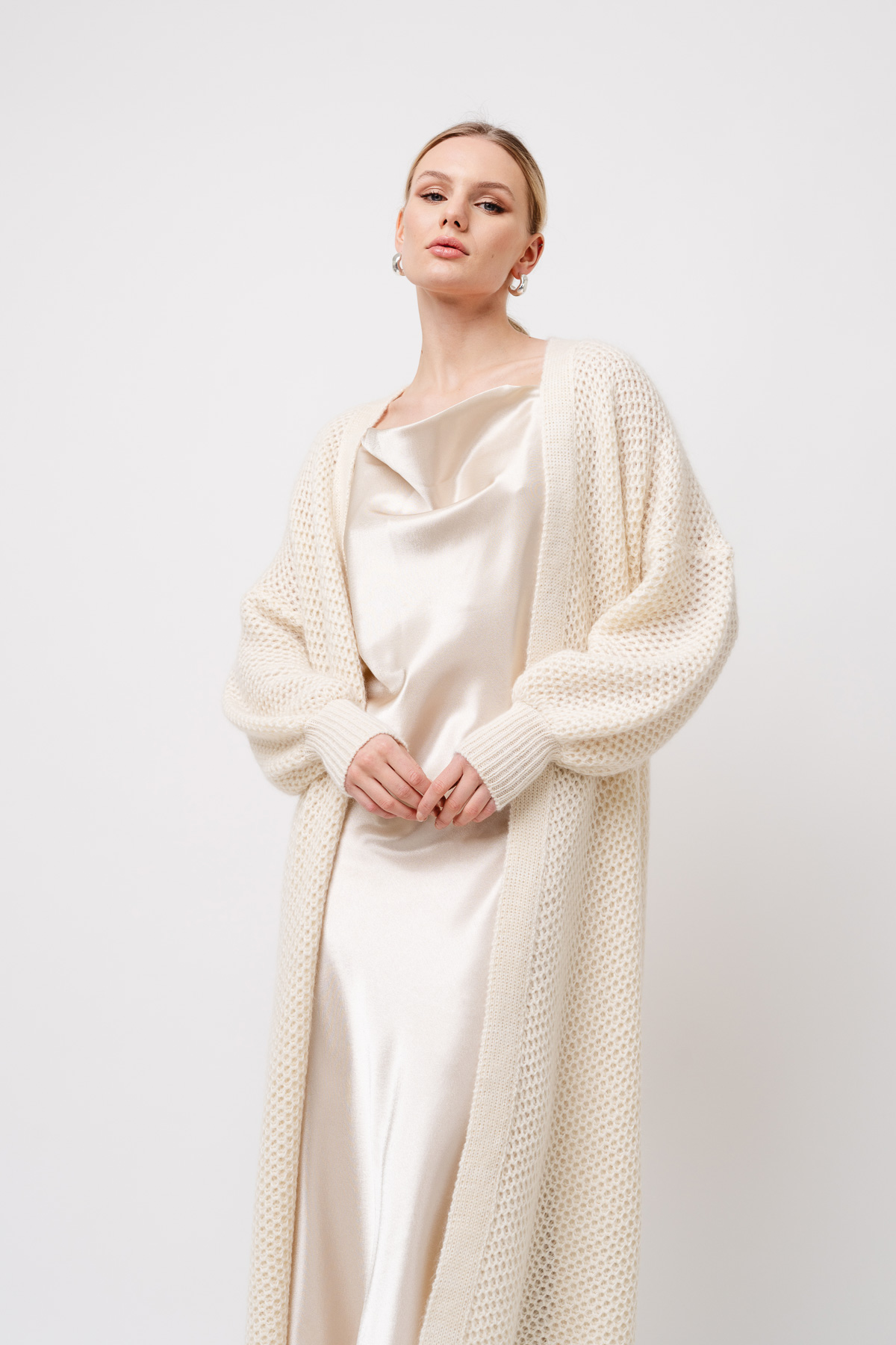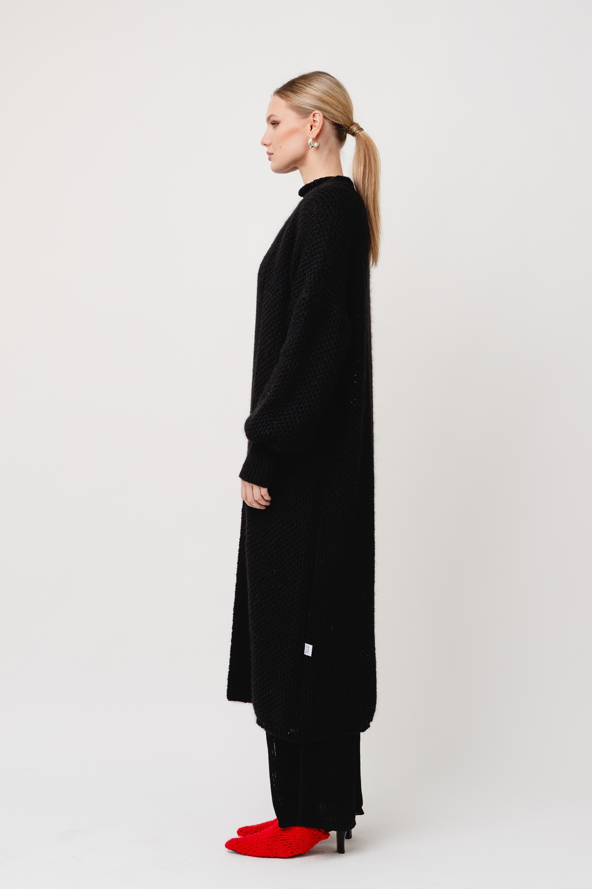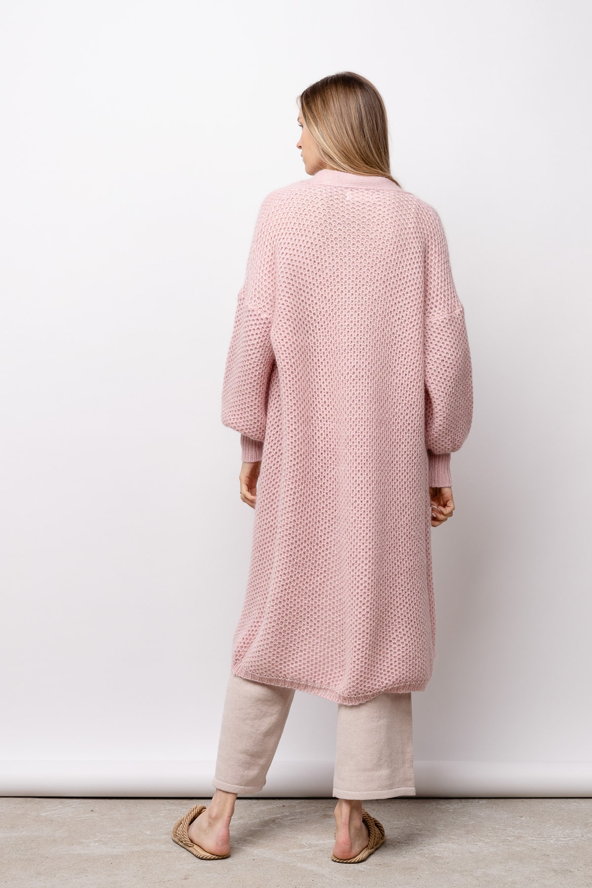 Long, textured cardigan.