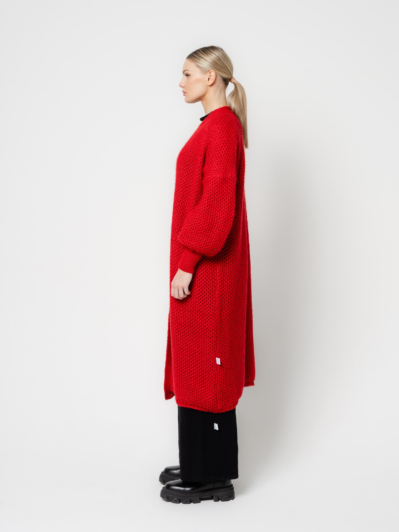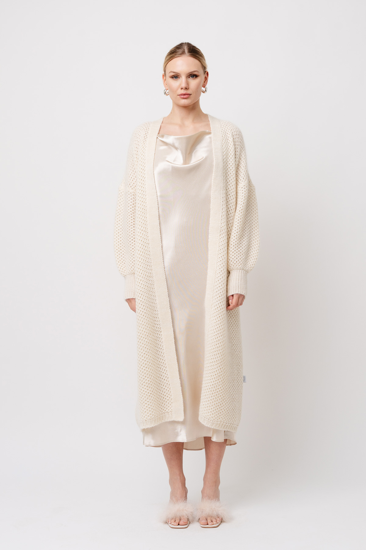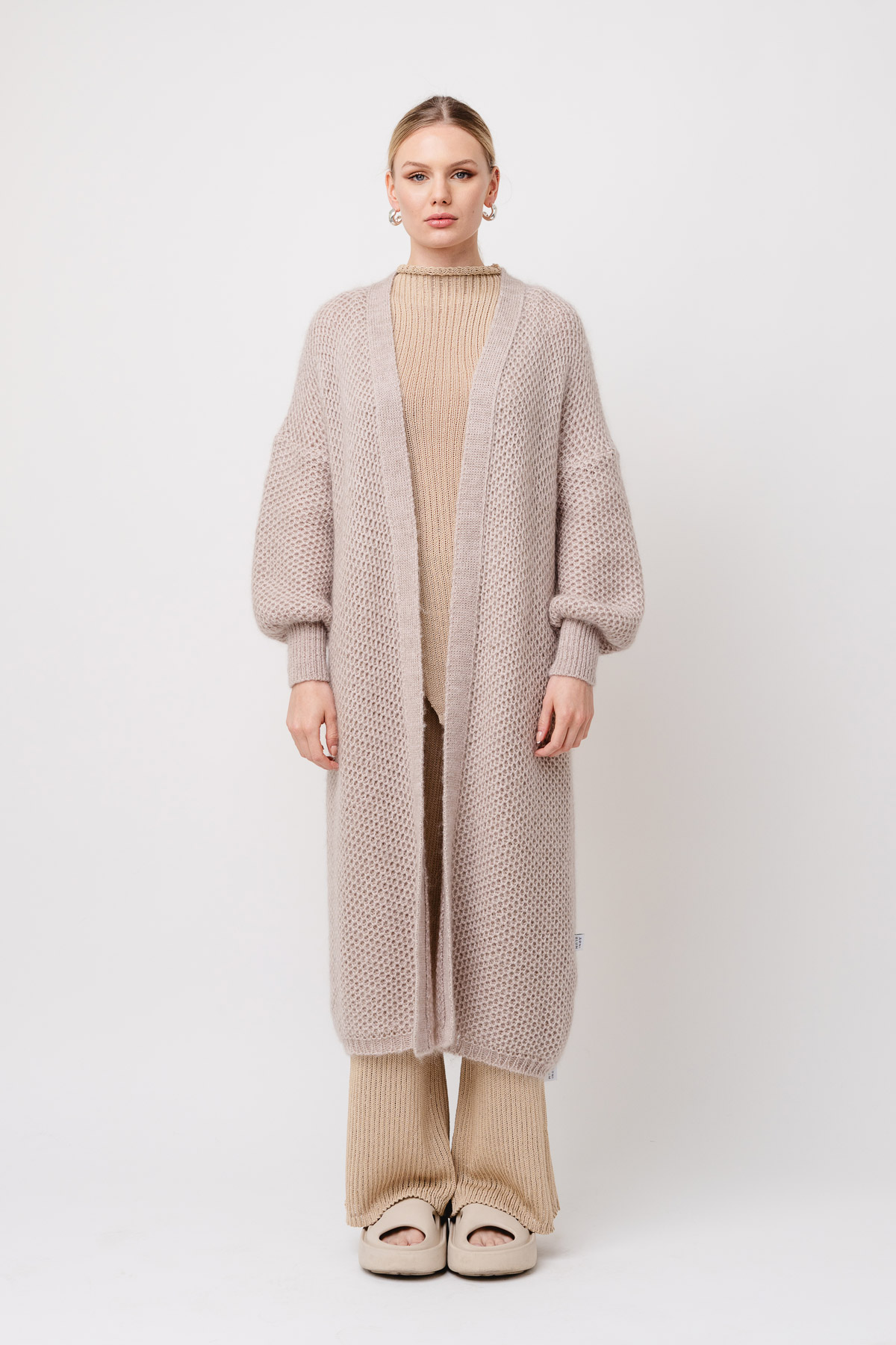 Long, textured cardigan.