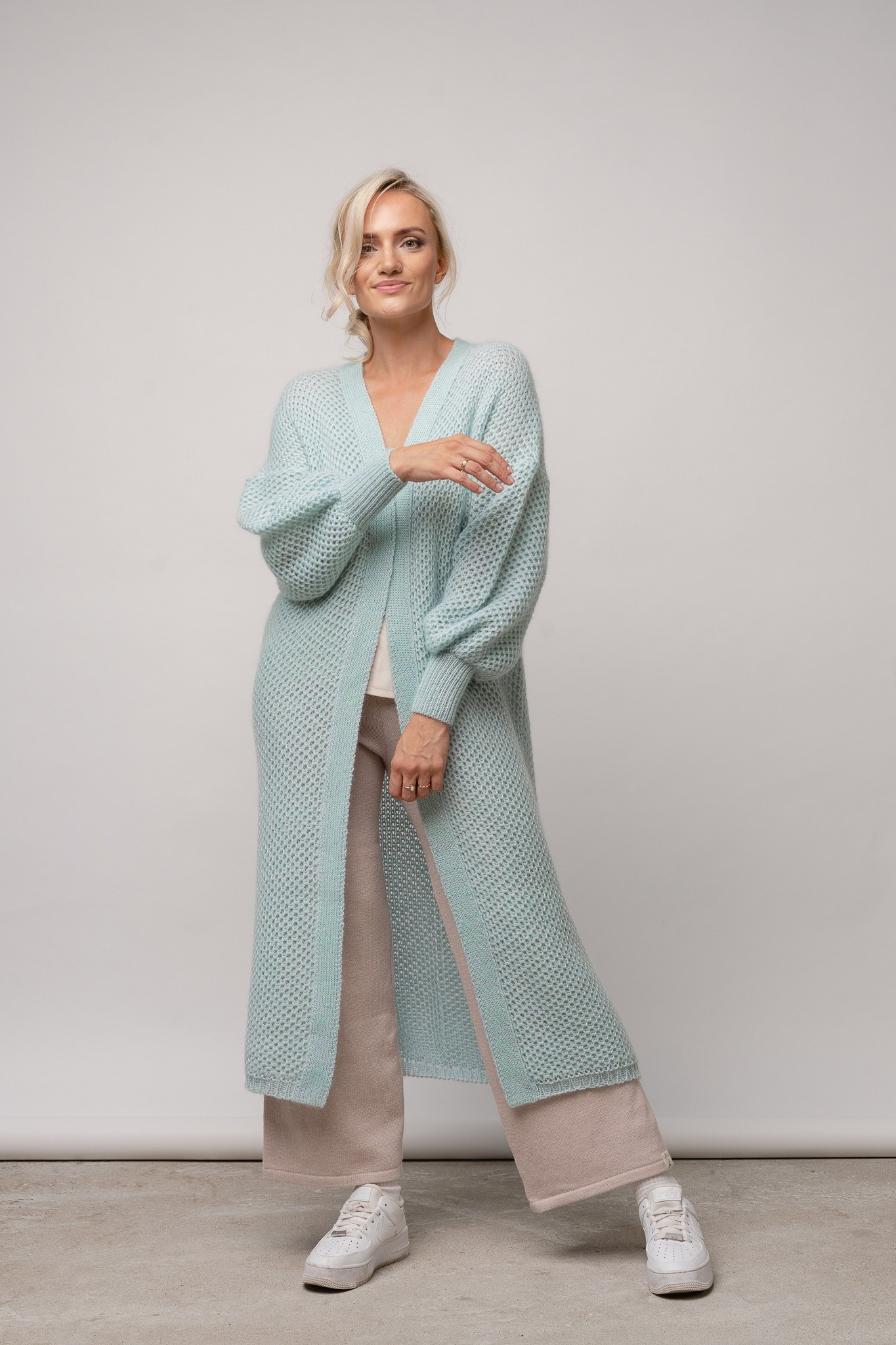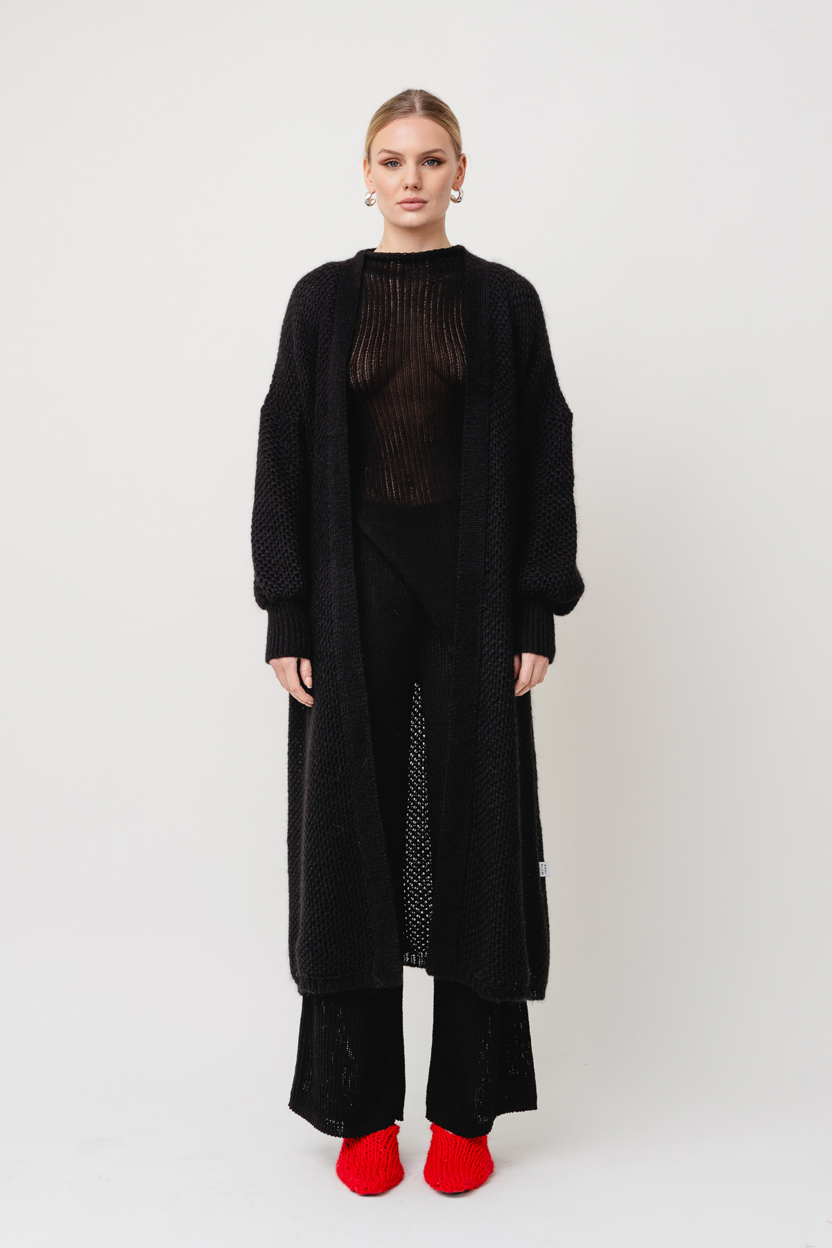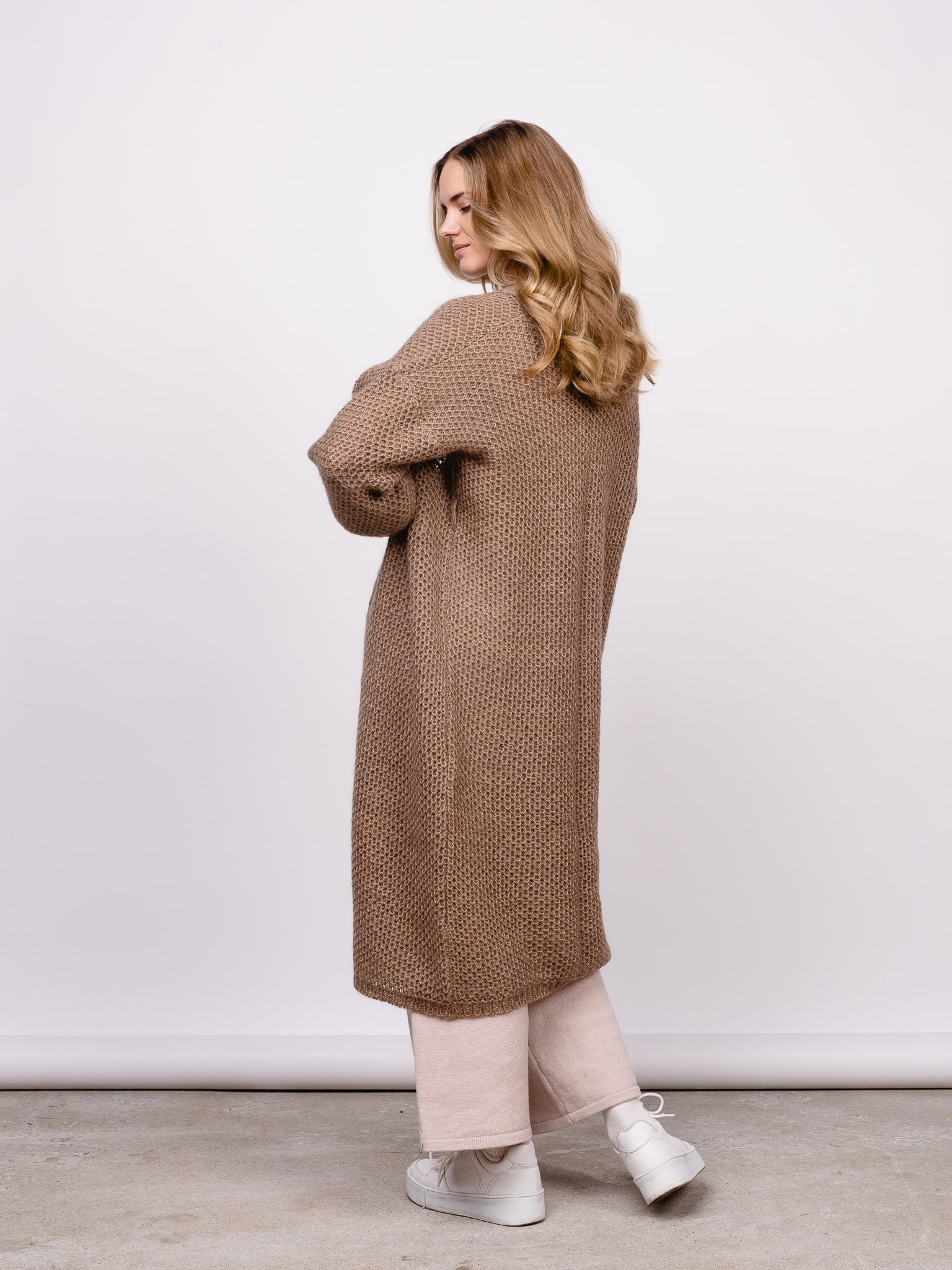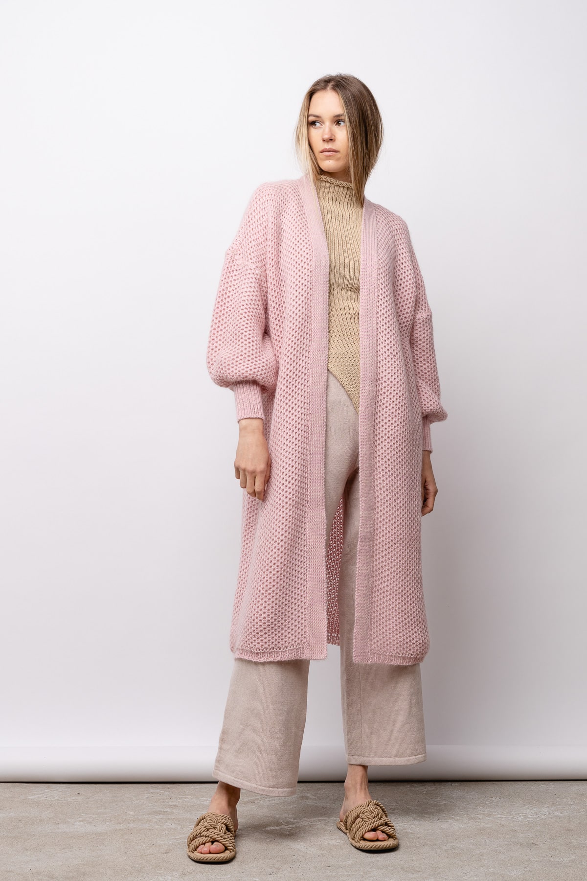 Long, textured cardigan.