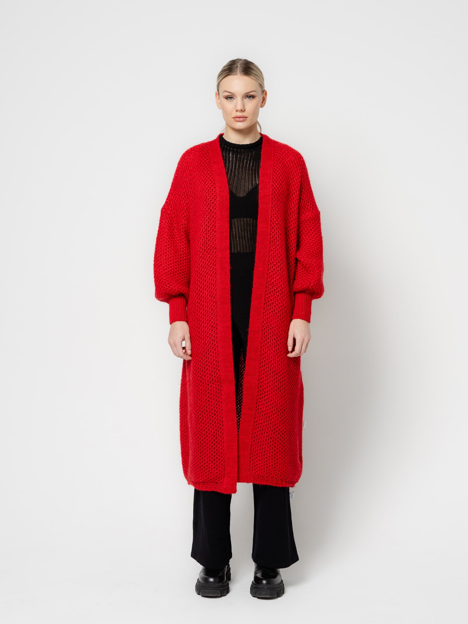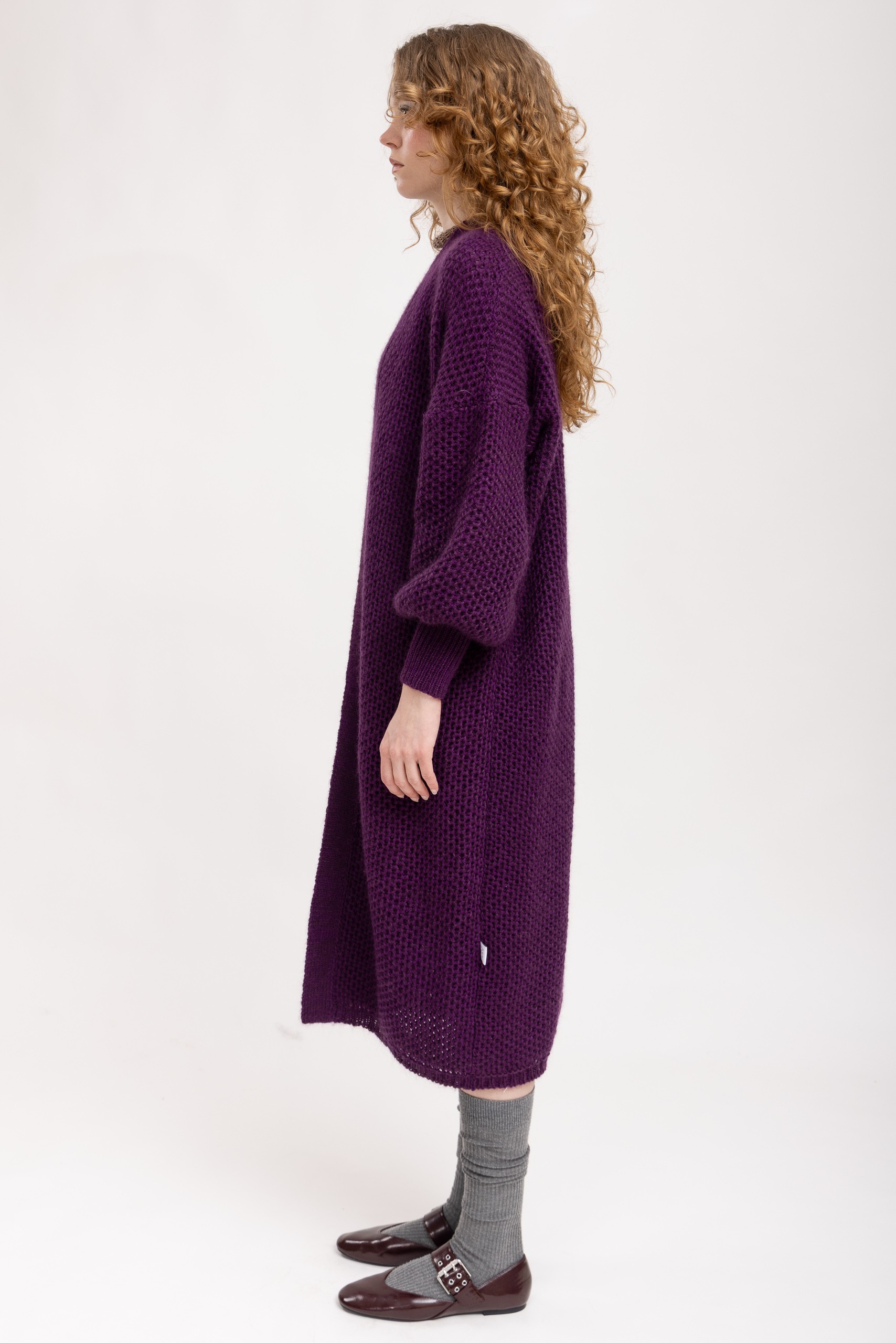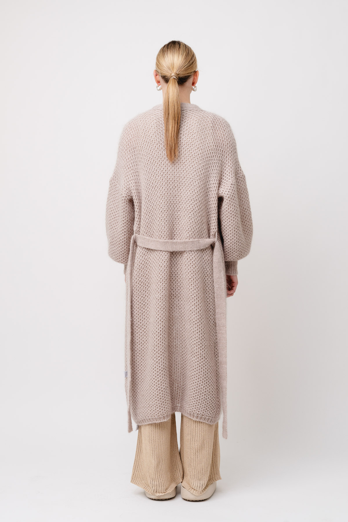Hand made from merino and mohair blend yarn. Relaxed silhouette with an adjustable waist tie.