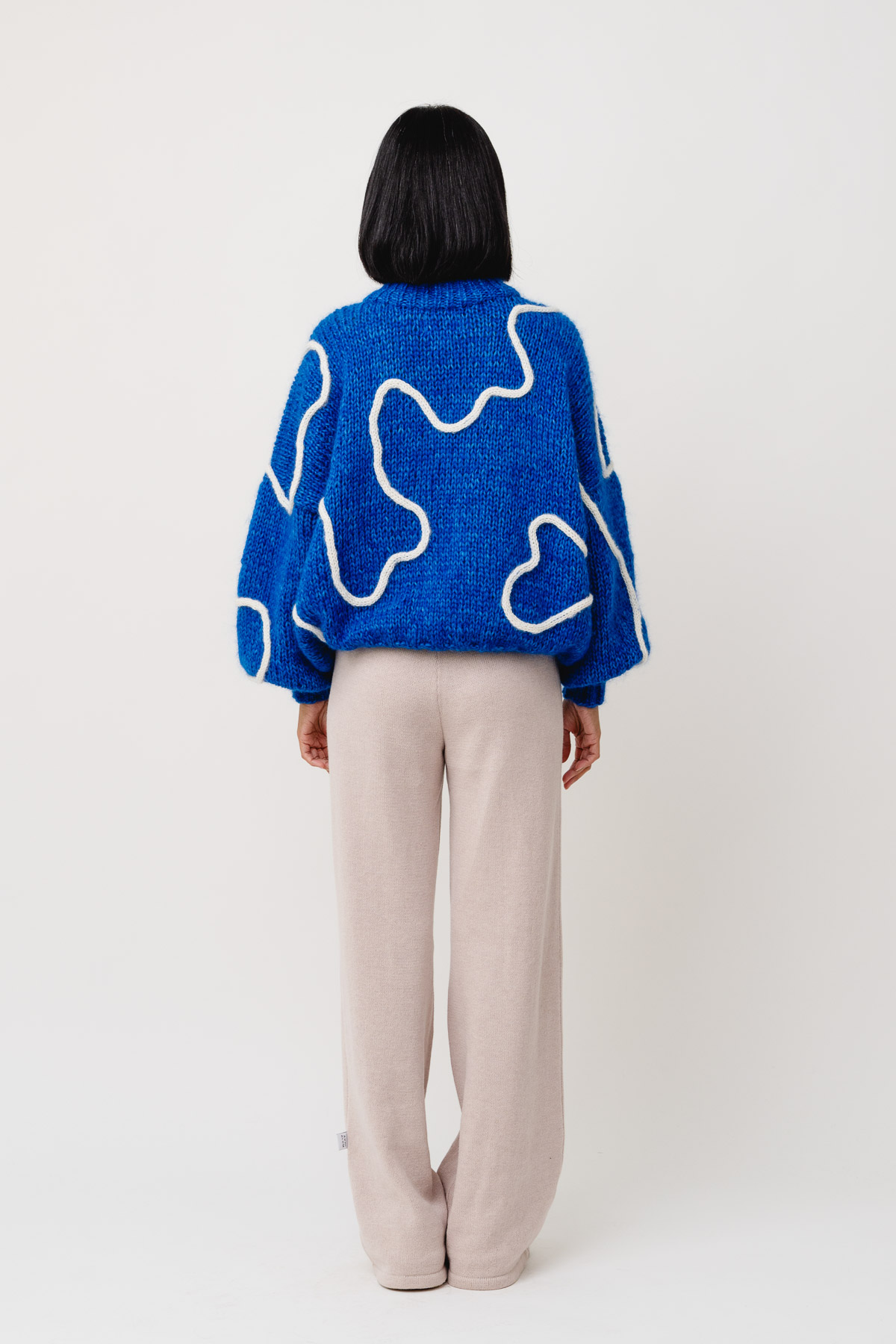 Hand knitted from alpaca and Japanese silk mohair yarn. Oversized silhouette with a relaxed, fluid drape. Finished with a hand-applied wave detail, creating a funky textured surface.