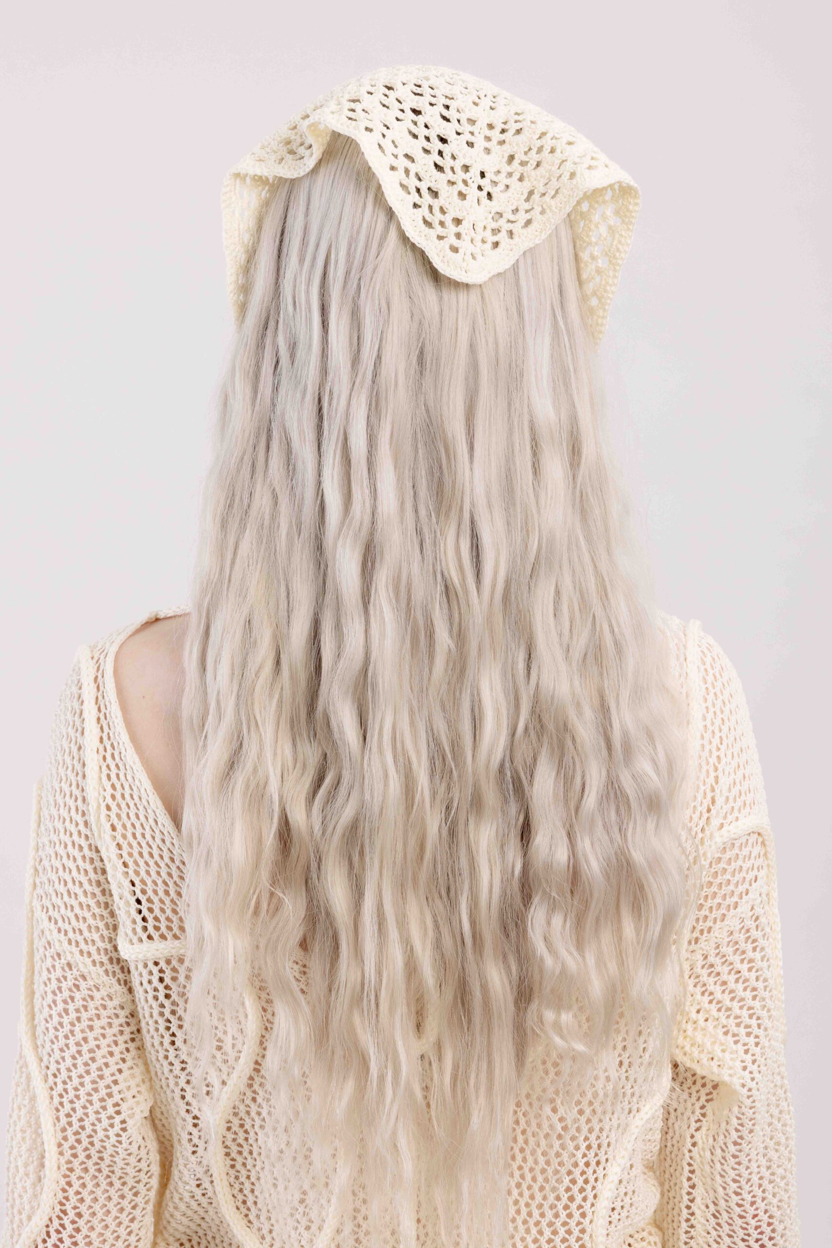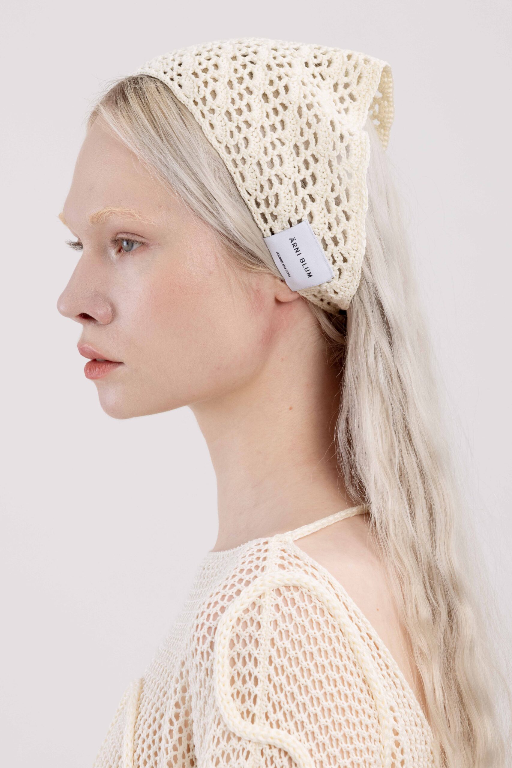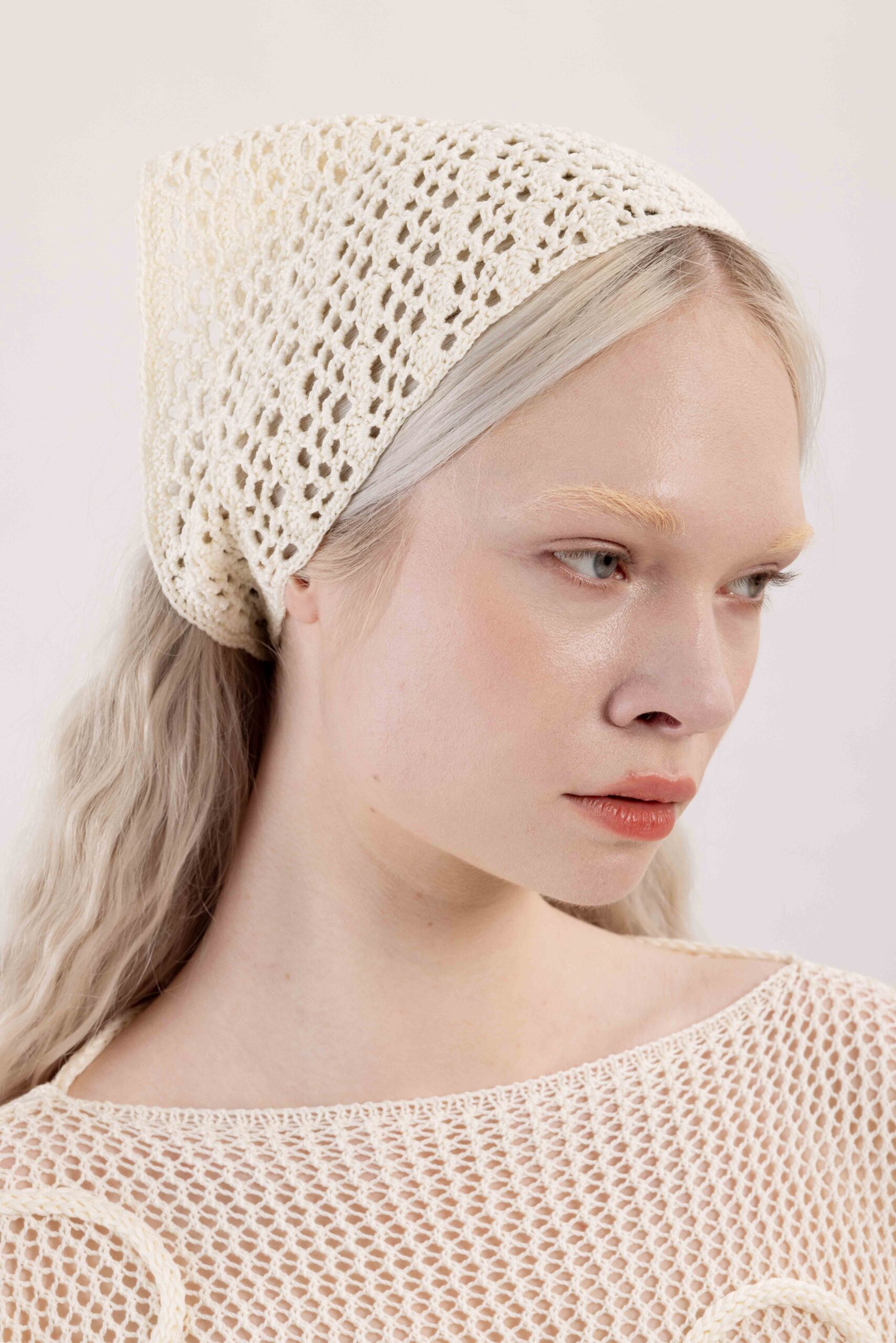 Hand crocheted from 100% cotton, featuring a delicate floral lace motif. Light and breathable, with a gently structured drape that frames the face.