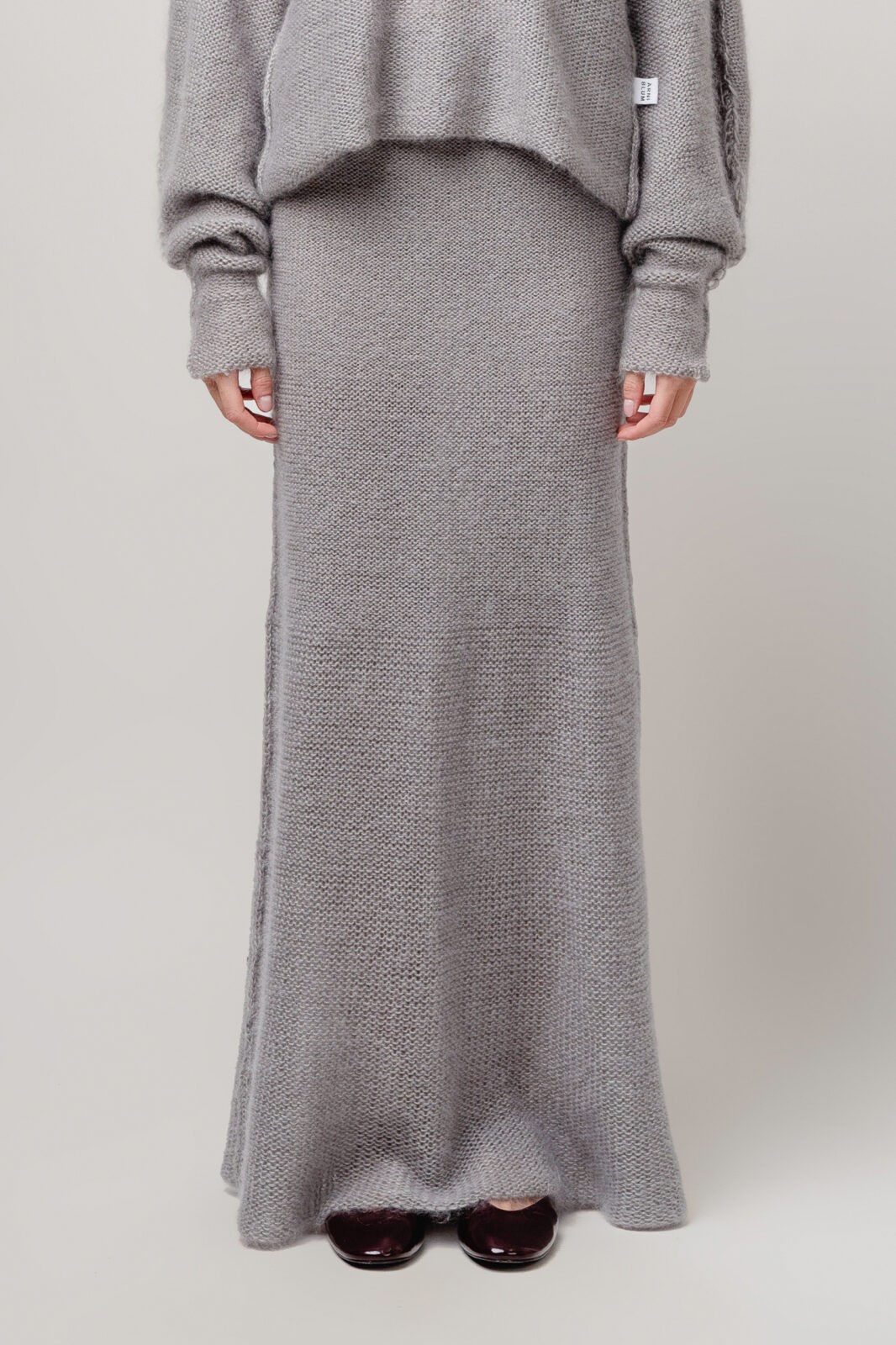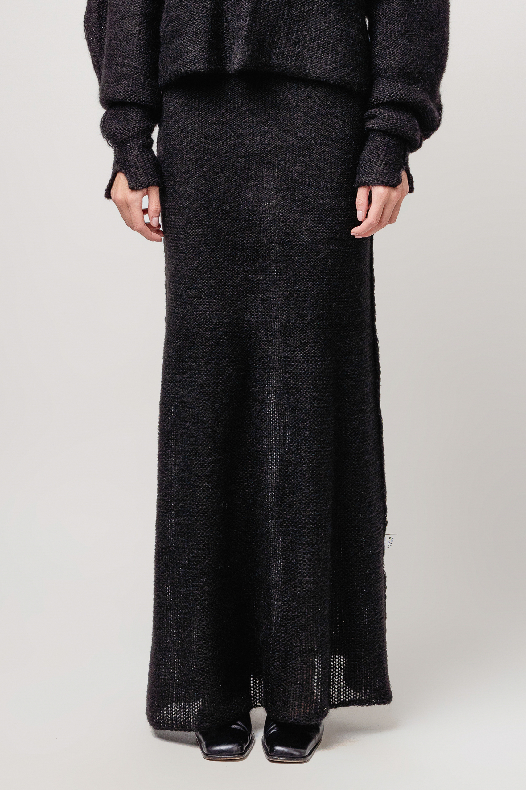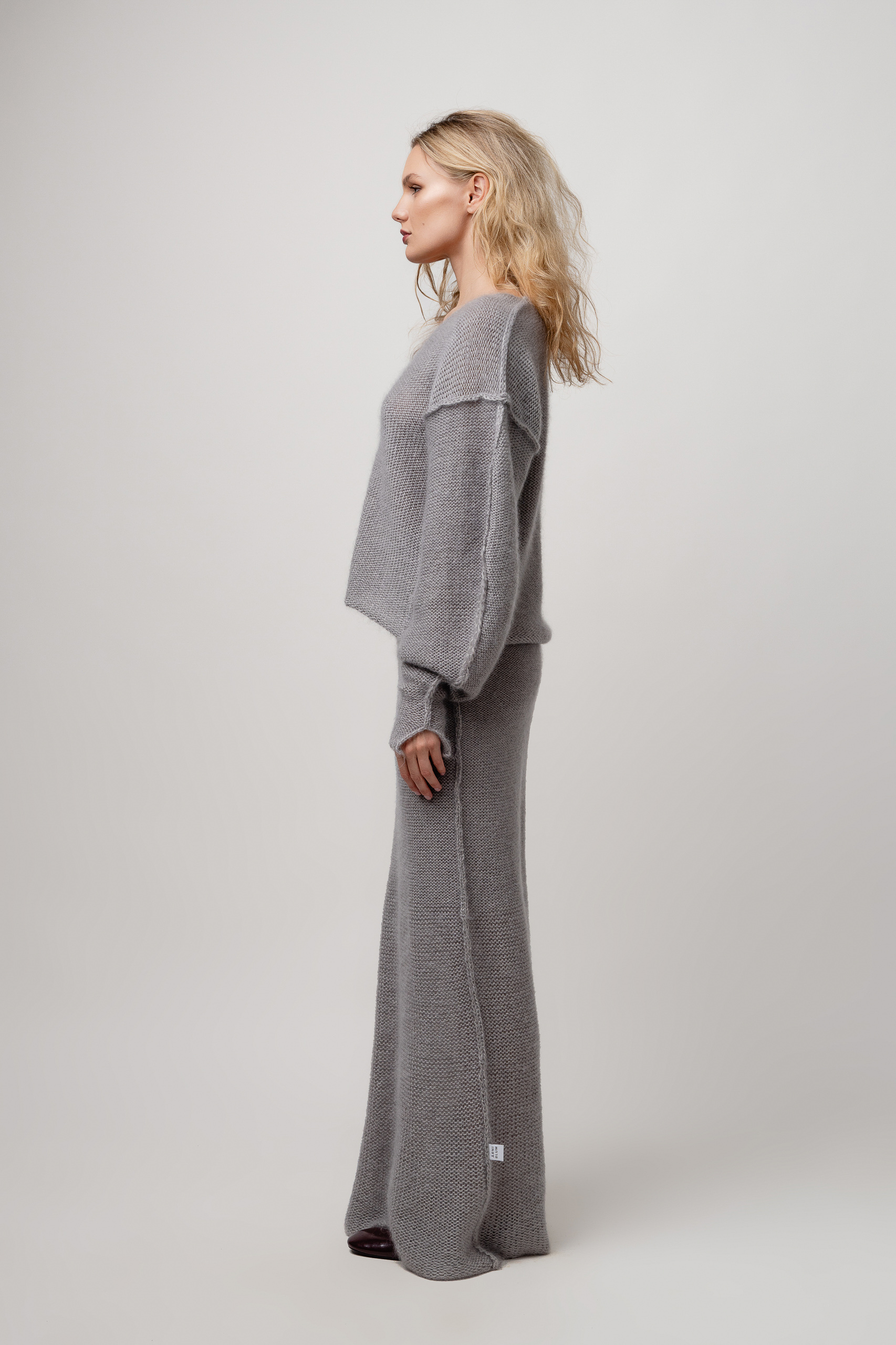Hand made from Japanese silk mohair yarn. Full length with a gentle flare. Elastic waist and outward seams.