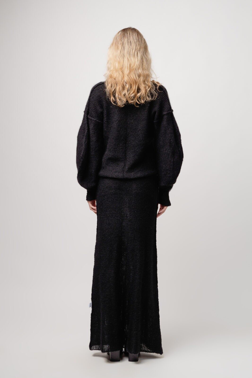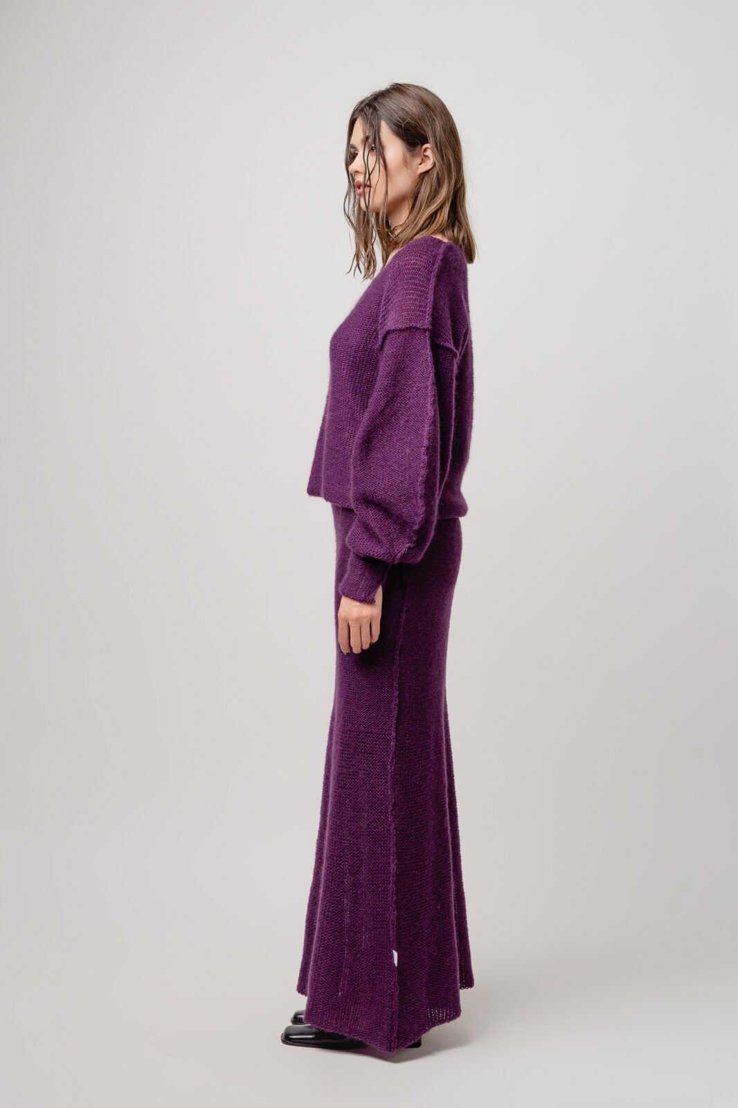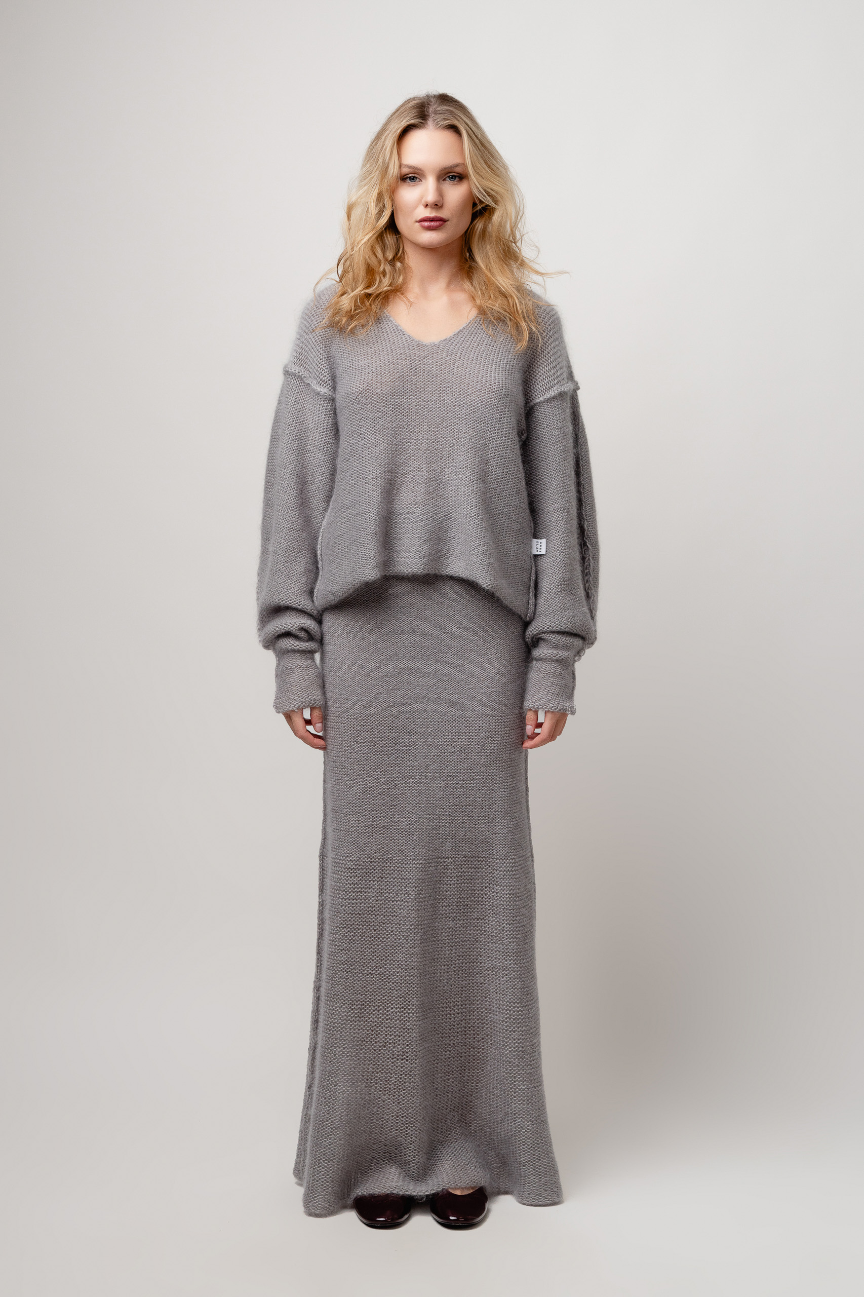 Hand made from Japanese silk mohair yarn. Full length with a gentle flare. Elastic waist and outward seams.