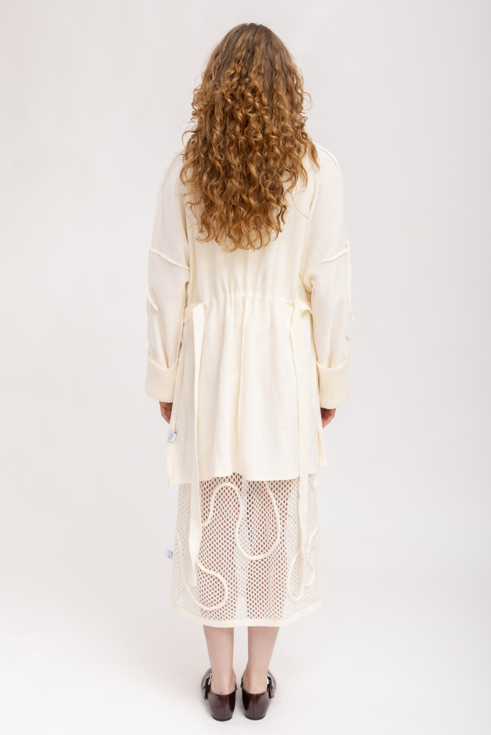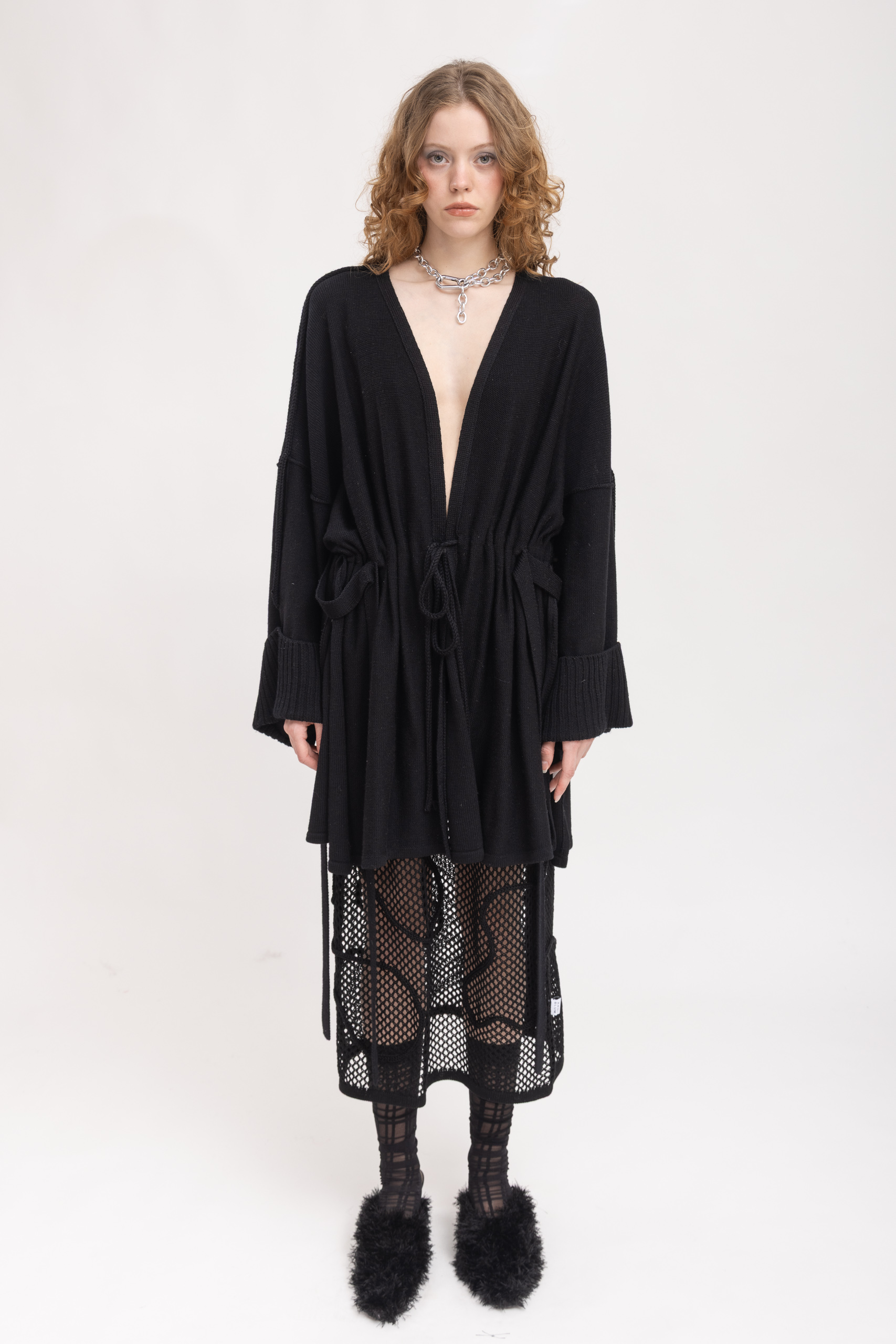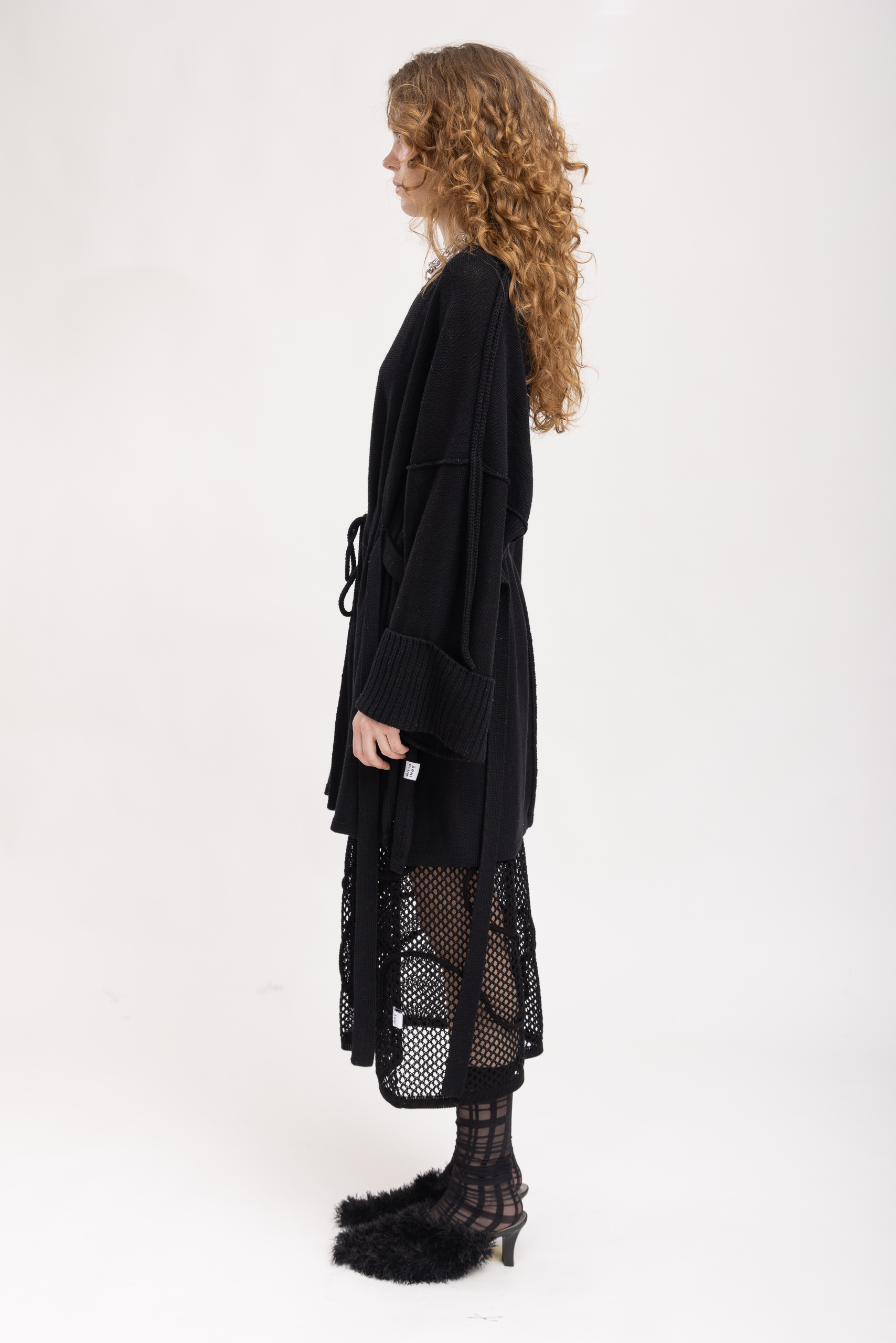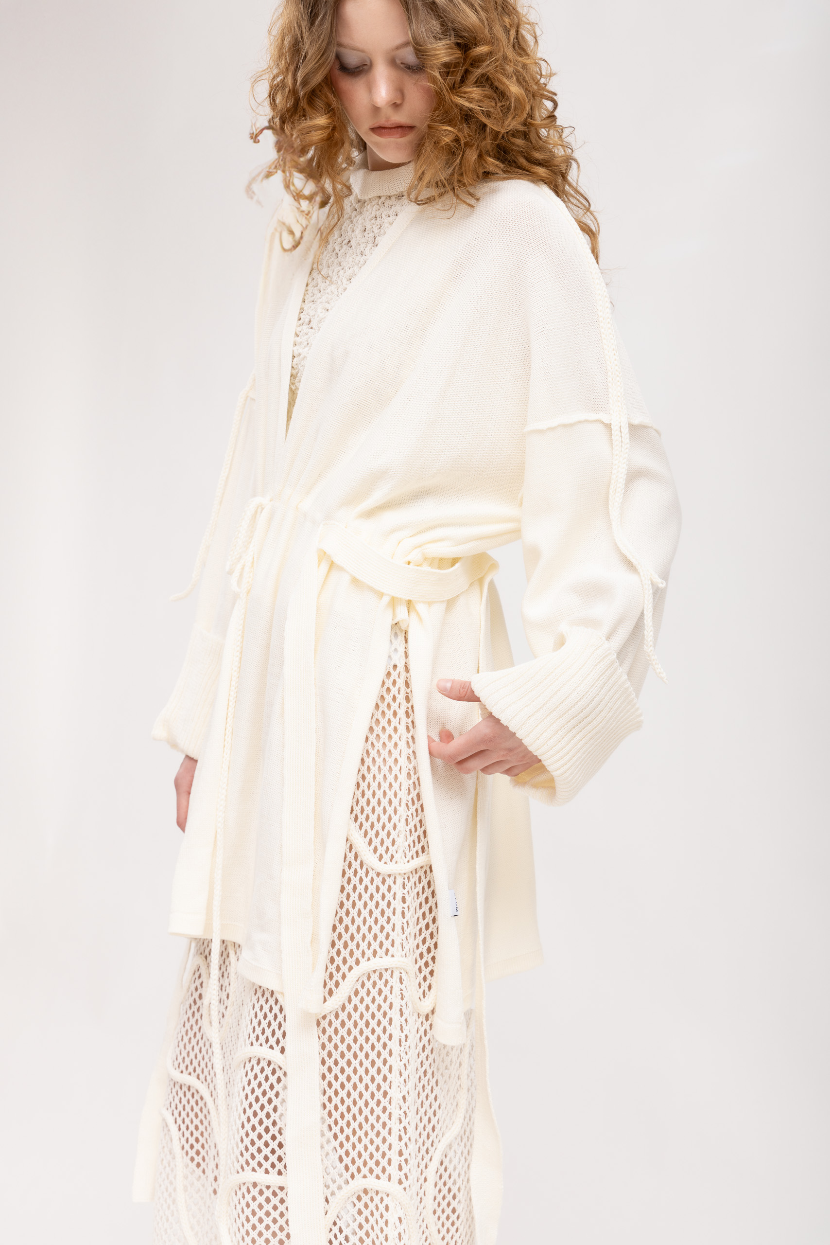 Hand made from organic cotton yarn. Robe-inspired silhouette with wide sleeves, a relaxed drape and adjustable waist tie.