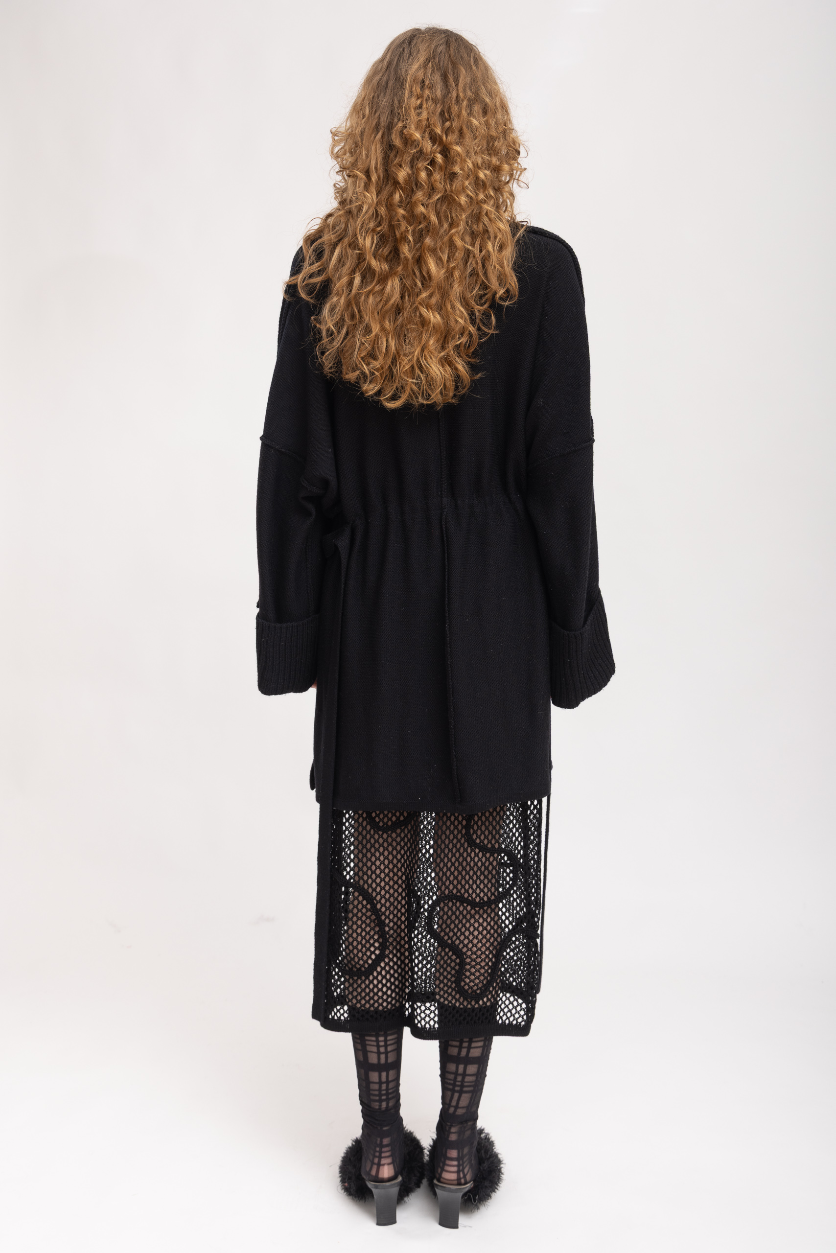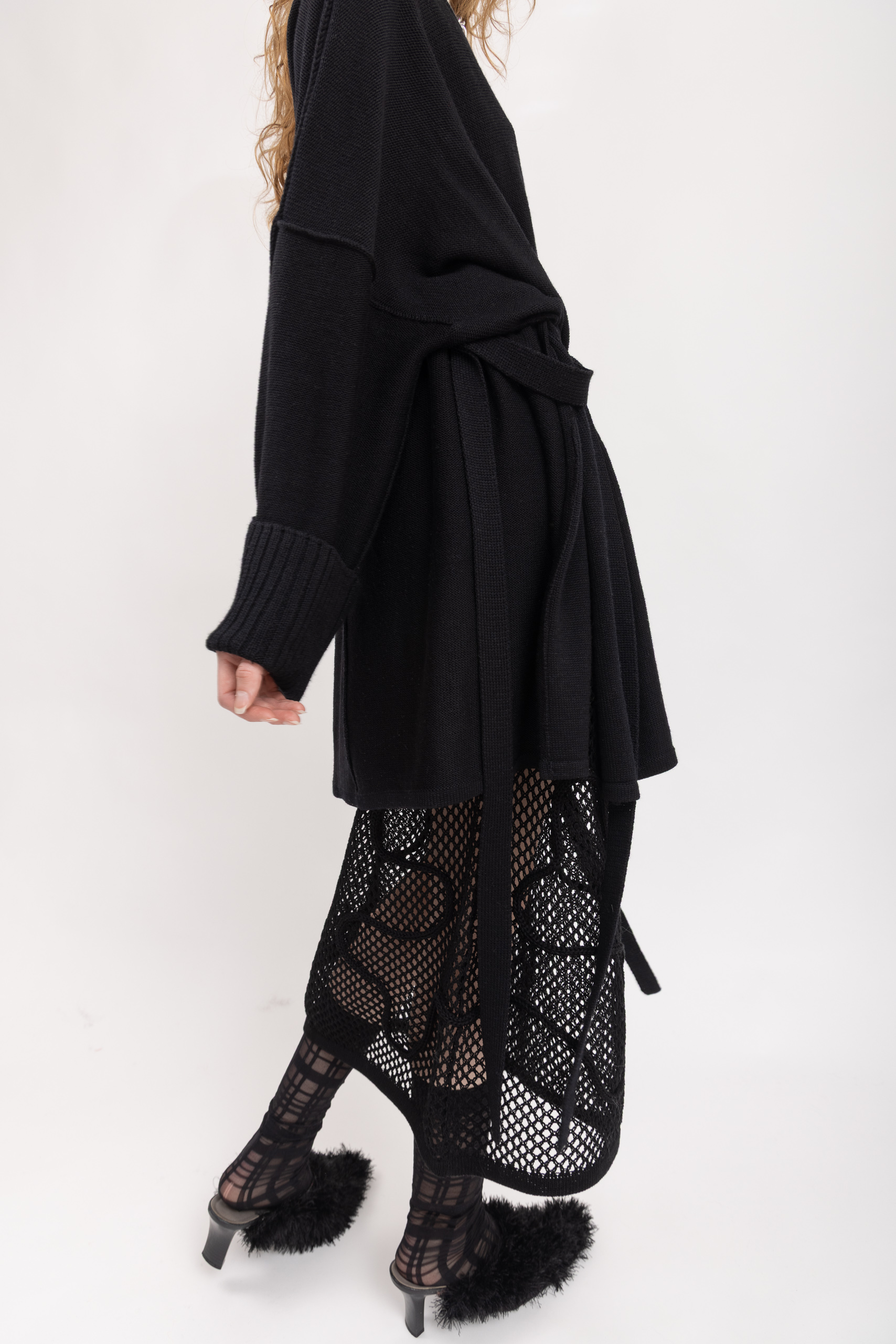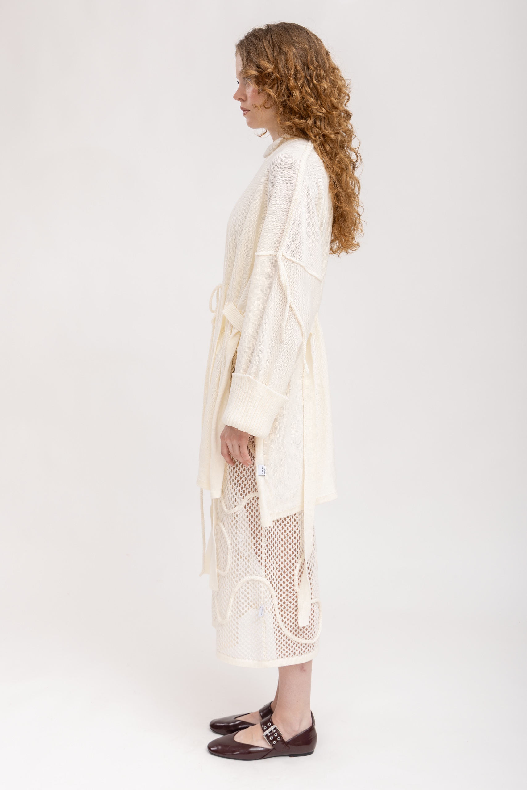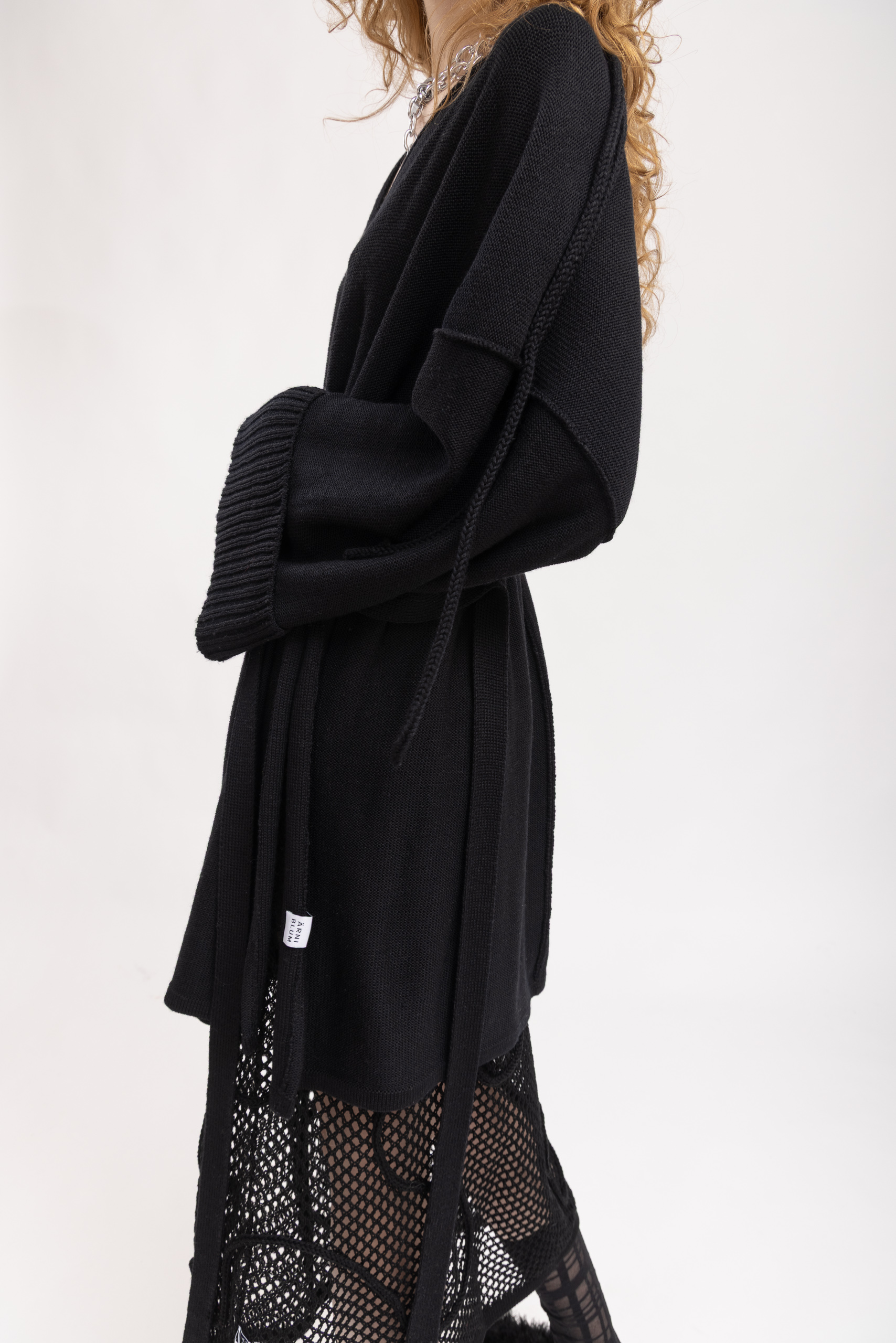 Hand made from organic cotton yarn. Robe-inspired silhouette with wide sleeves, a relaxed drape and adjustable waist tie.