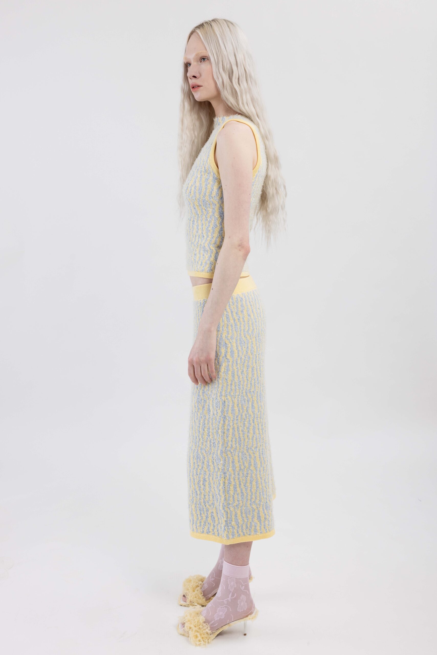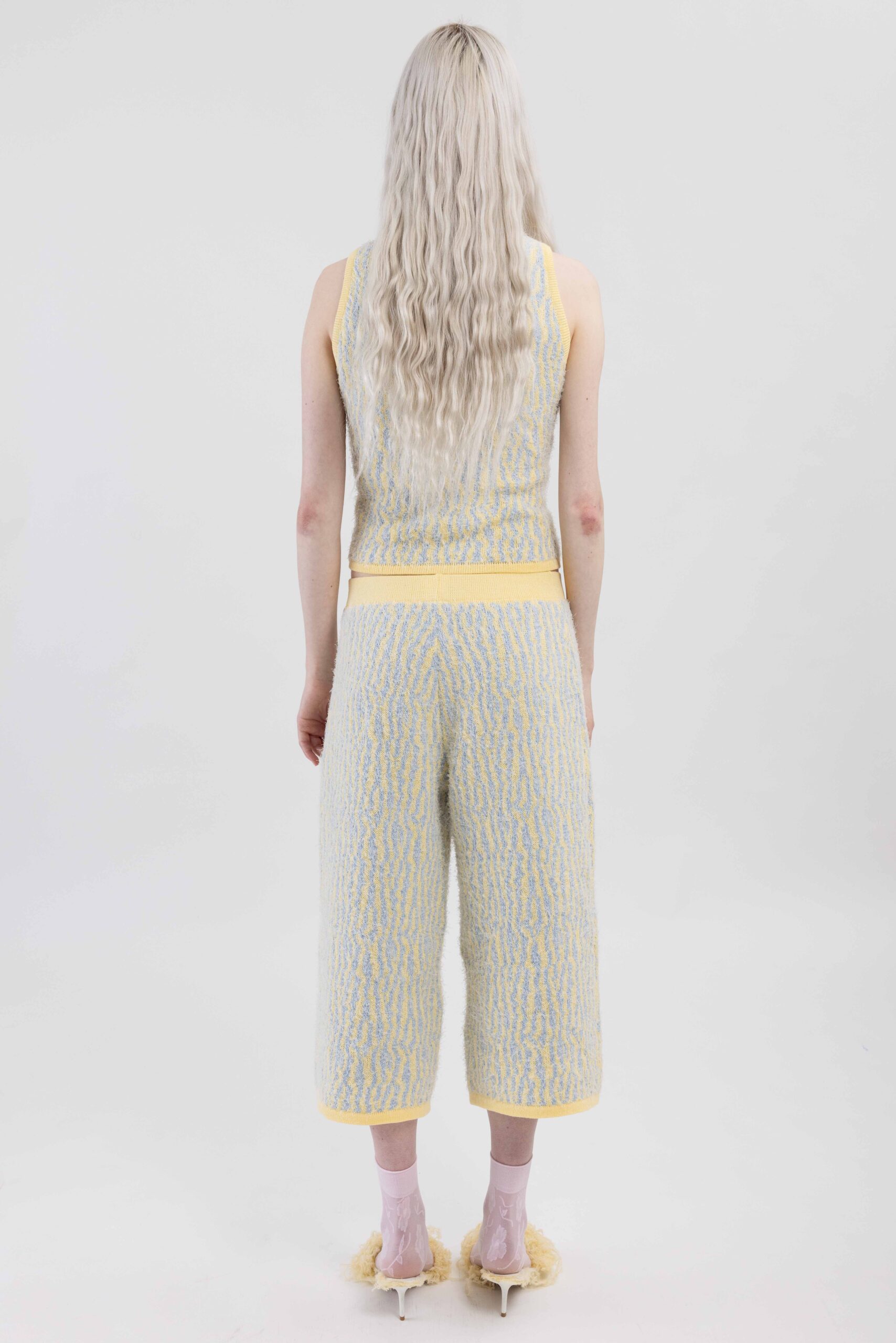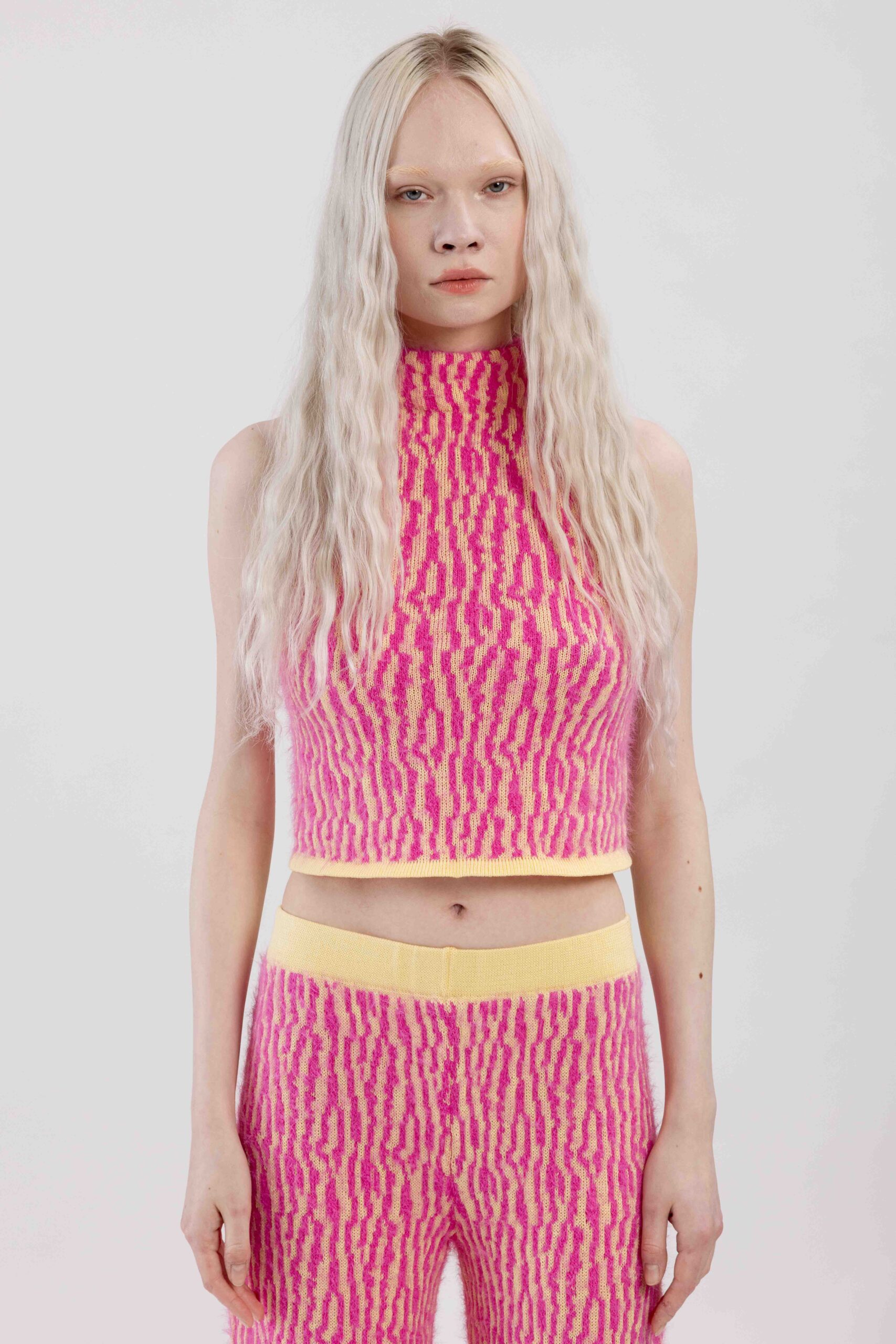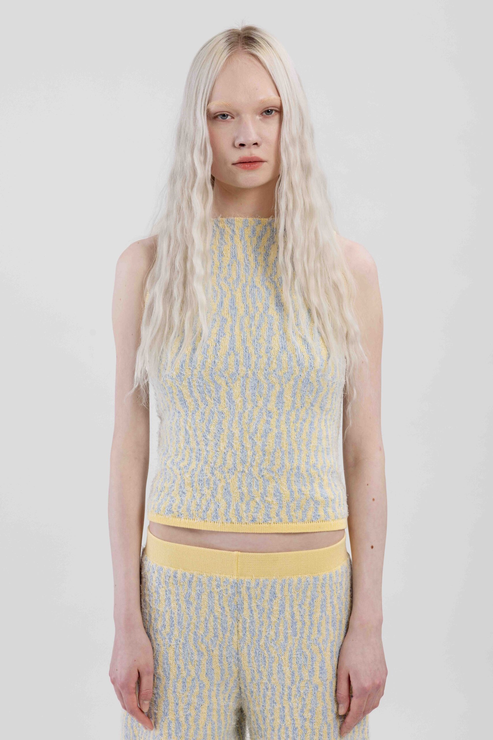 Knitted with ÄRNI BLUM’s signature roots pattern, creating a textured surface that gathers and shapes the body. A dynamic interplay of textures and tones adds depth and movement.
