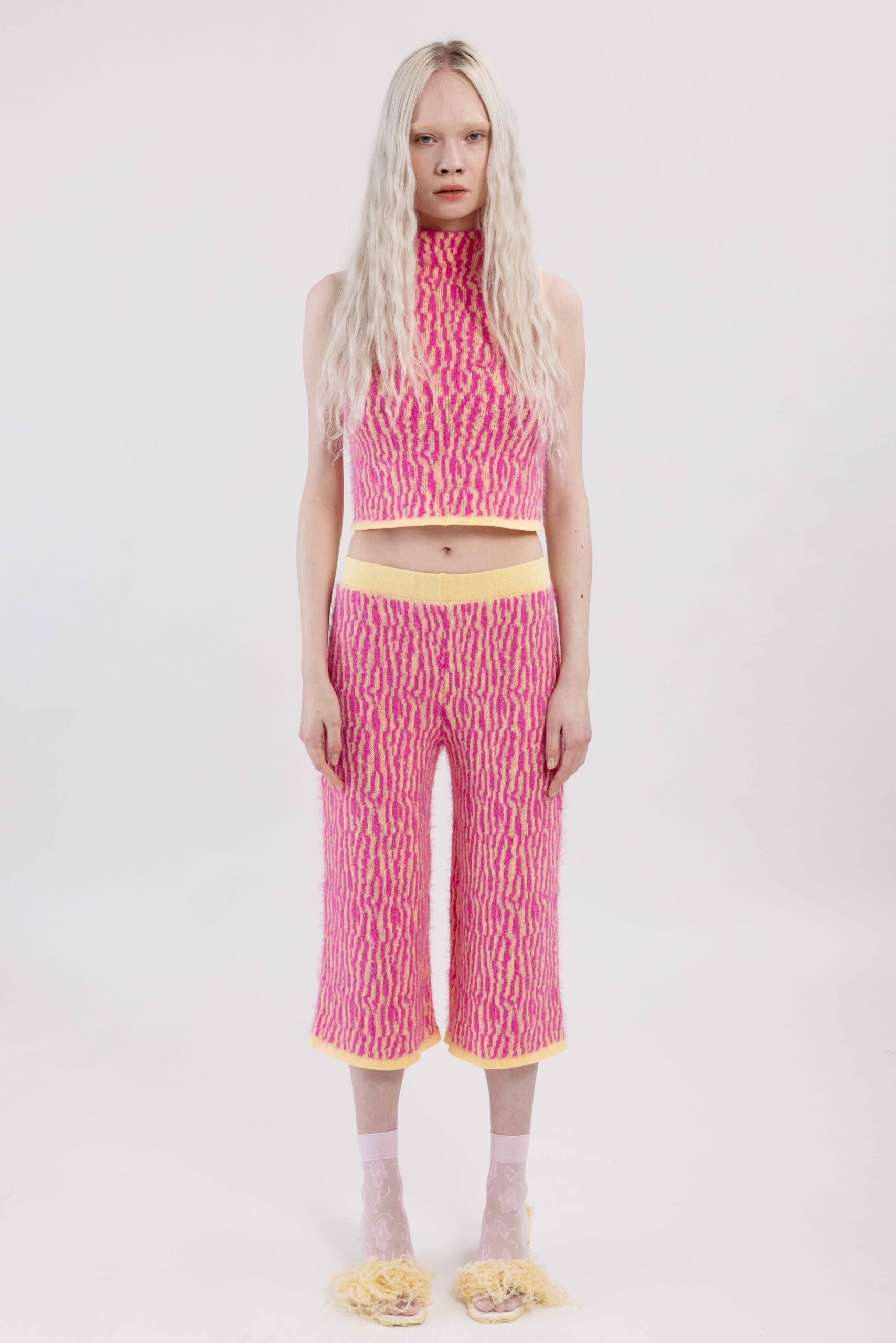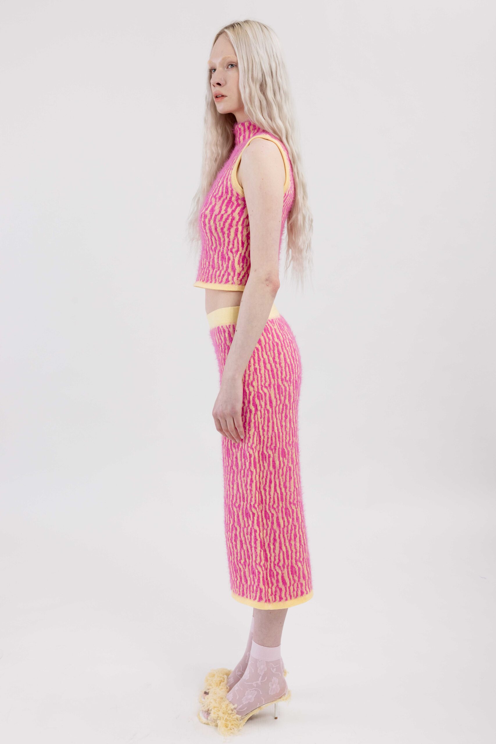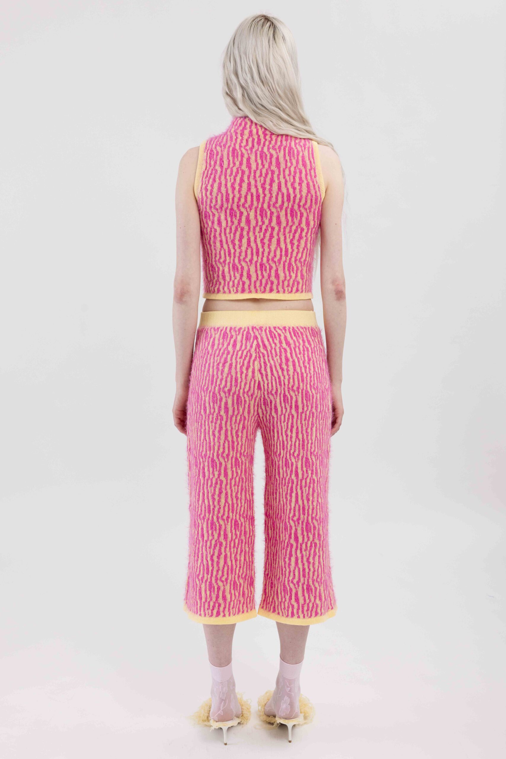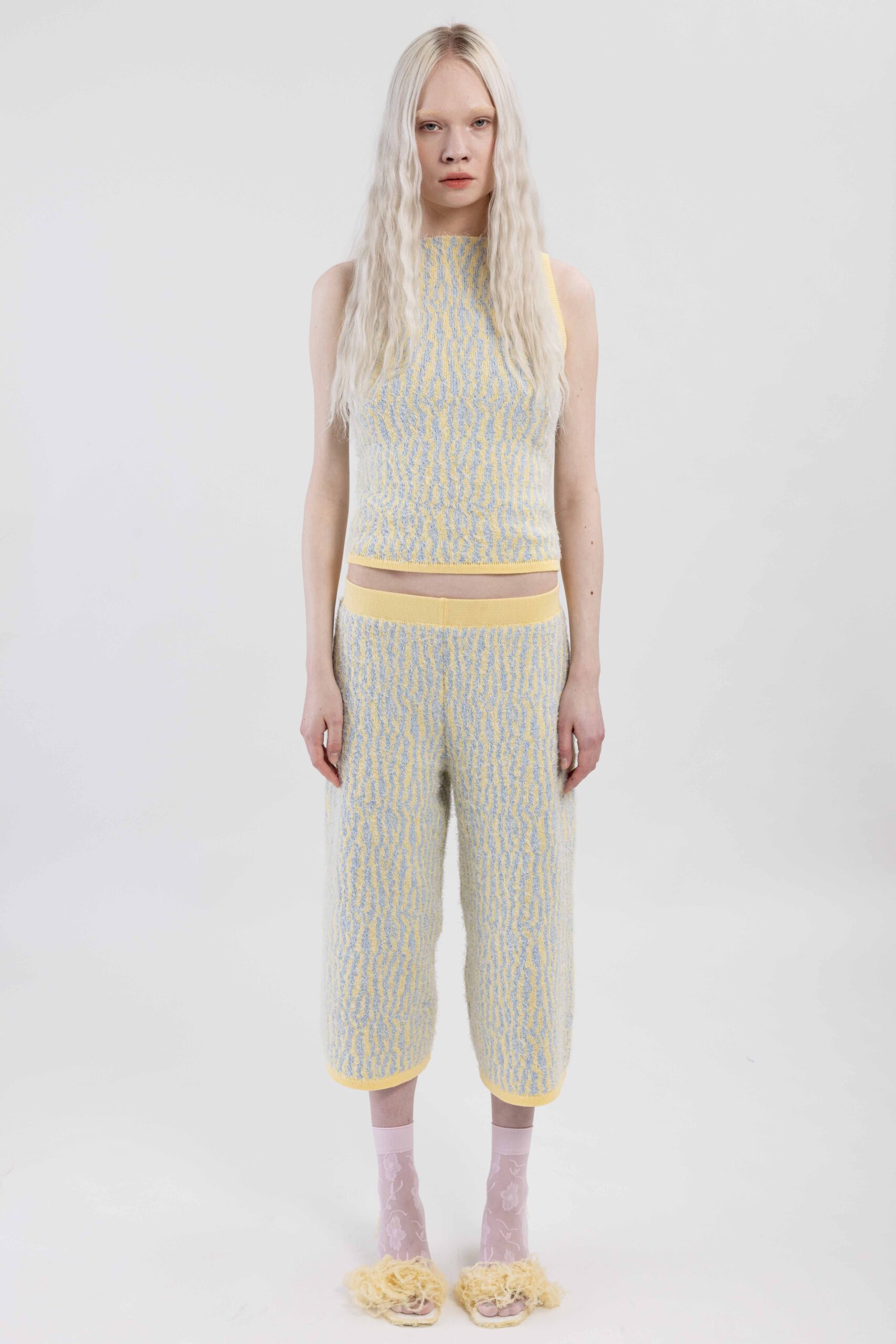 Knitted with ÄRNI BLUM’s signature roots pattern, creating a textured surface that gathers and shapes the body. A dynamic interplay of textures and tones adds depth and movement.